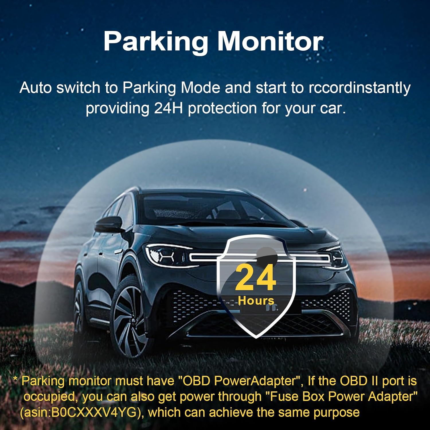 - 【Please Note】Your car must have an Auto-Dimming Rearview Mirror Plug Power Adapter(10Pin square plug), otherwise, power can only be obtained through OBD or Fuse box. Parking monitor must have OBD Power Adapter or Fuse Box Power Adapter(asin:B0CXXXV4YG).