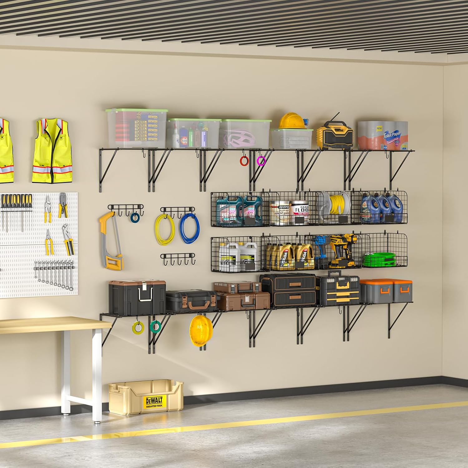 - LARGE STORAGE CAPACITY: The package includes 2 shelves, 2 wire baskets, 2 hook racks, and 4 hooks. This unique storage combination has a large enough capacity to store a lot of garage supplies. Making full use of this shelving capacity to make your home look cleaner and tidier.