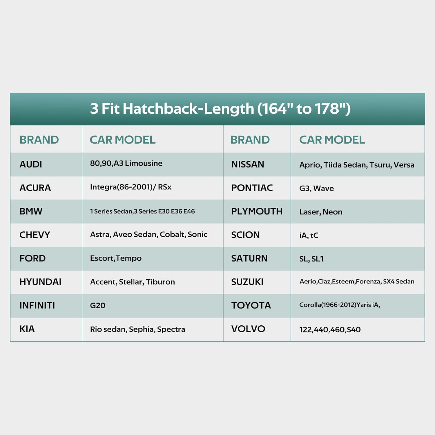 - 【CHOOSE THE RIGHT MODEL】: Molebt car cover fits for hatchback 164 to179 inch. For example Mazda 3 hatchback, Honda Civic Hatchback, Toyota Corolla Hatchback, Subaru Impreza Hatchback, Ford Fiesta, Volkswagen Golf/GTI, Hyundai Kona, Nissan Leaf, Chevrolet HHR, Chrysler PT Cruiser, Fiat 500X/500L, Kia Forte5, Mini Clubman etc.