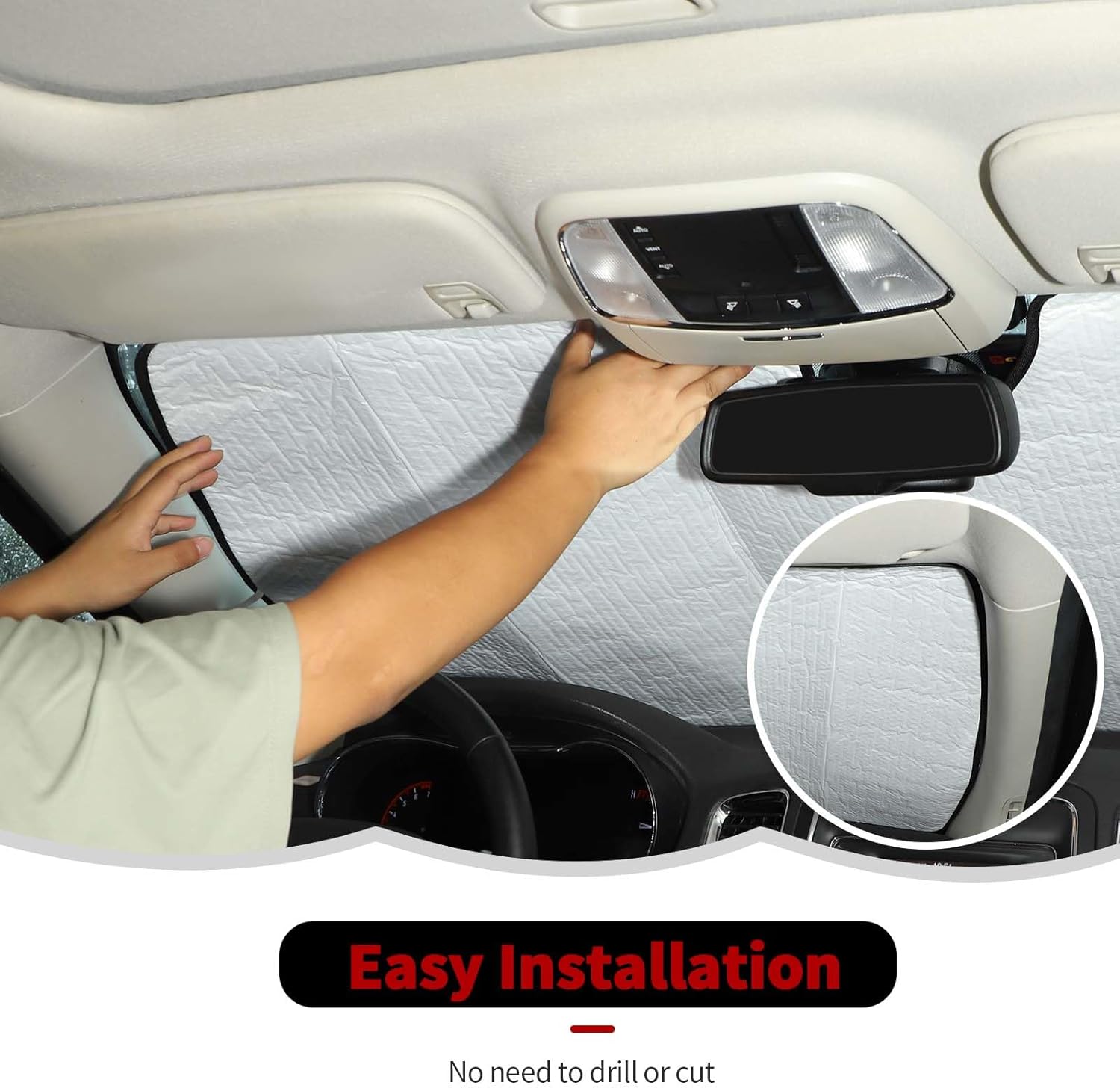 - 【EASY INSTALLATION】No tools required, easy to install,Unfold the sunshade and put it flat under your windshield, precise model structure allows you to operate more easily without adjusting.Finally, pull down each sun visor to add extra support
