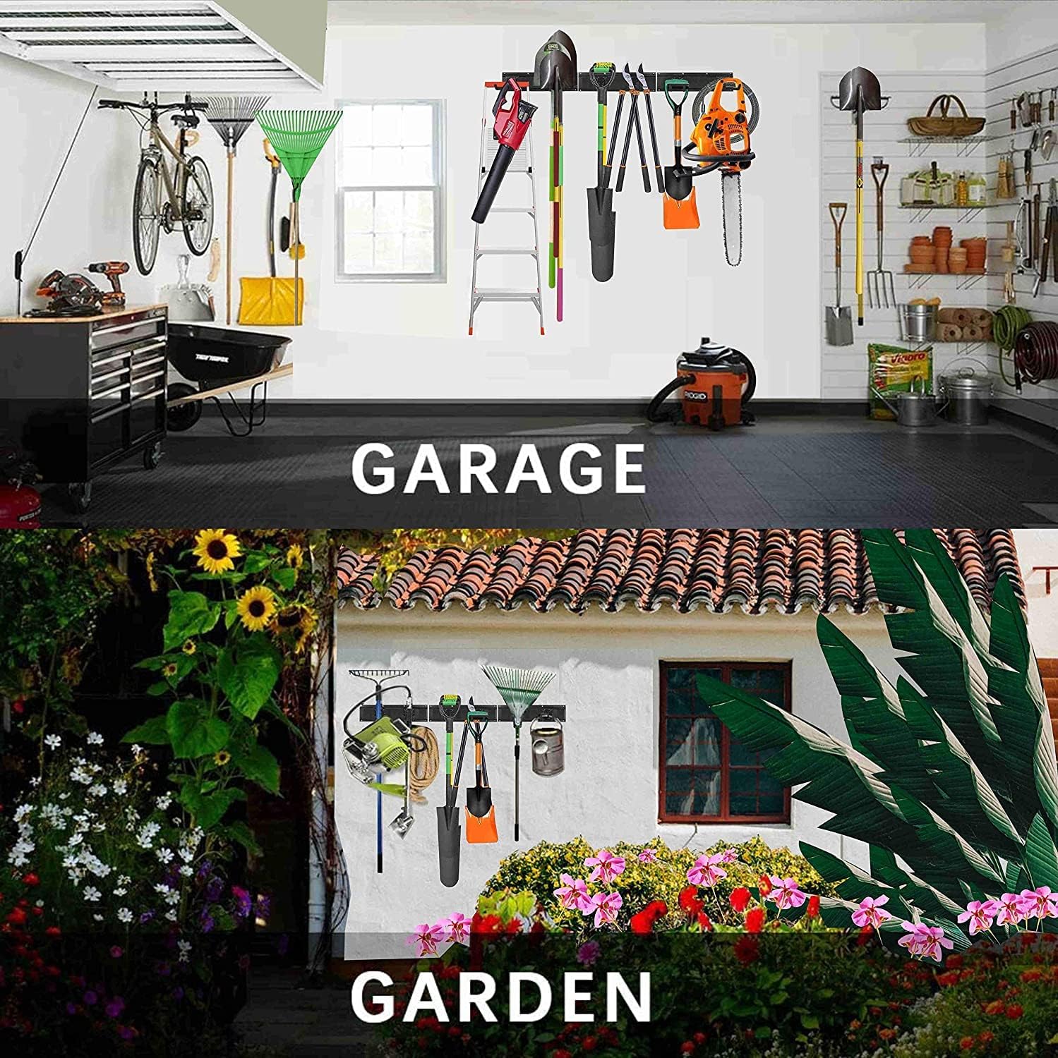 - ADJUSTABLE STORAGE SOLUTION: This garden tool organizer comes with 9 hooks that can be effortlessly positioned and adjusted along the rails. Additionally, the 4 storage straps allow you to neatly loop, tightly wrap, and conveniently hang cables, hoses, cords, and ropes on hooks.