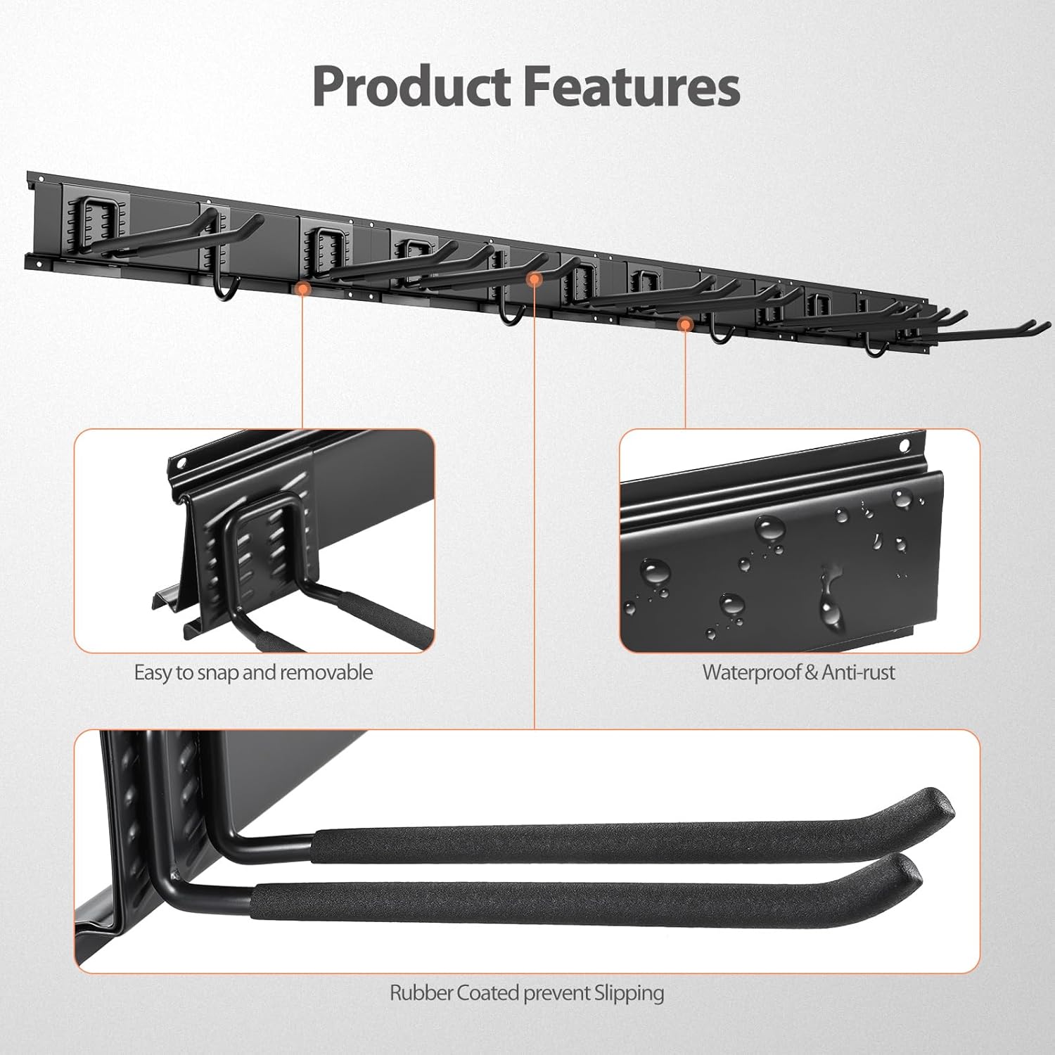 - HEAVY DUTY GARAGE WALL ORGANIZER: Crafted from solid steel and coated with durable black powder, our wall-mounted storage system is built to last a lifetime while preventing rusting. Featuring rubber-coated double long hooks, it offers added protection against slippage and damage, ensuring your tools are securely stored and maintained in top condition.