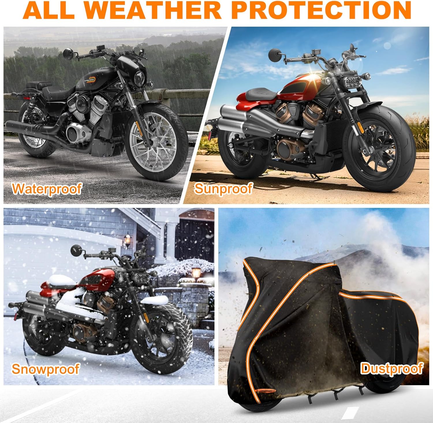- 【HOW ABOUT THE DETAILS】1. Left and right sides each have a ventilation hole, which can prevent moisture under the cover. 2.Black PU waterproof coating: UV protection, high temperature protection, preventing the interior leather and plastic from cracking and deteriorating 3. Two full orange reflective strips to prevent collision at night and also help you find your motorcycle at a glance. 4. Anti-theft locking holes on the front wheel, perfect protection for your motorcycle, don't worry about losing your motorcycle.