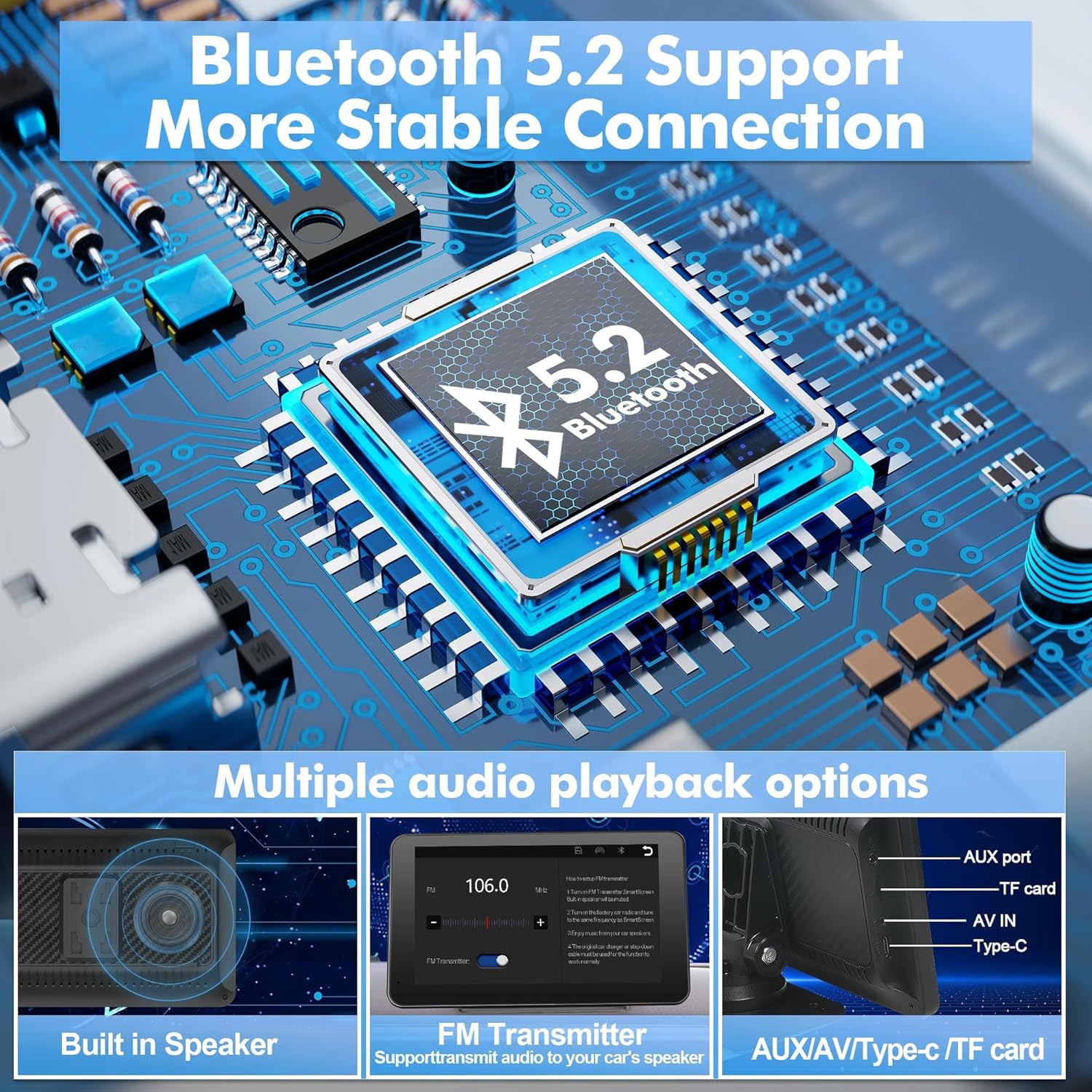 • 【Multiple Audio Output & Voice Control】-The portable carplay display drive play for cars can be controlled through Siri/Google Voice Assistant. No need to touch the android auto head unit car screen if you want to answer the phone, play music and read message, and you just say the command. What's more, the car radio receiver comes with FM transmission and built-in stereo speakers with AUX car stereo audio cable input, allowing you to enjoy an excellent music listening experience.