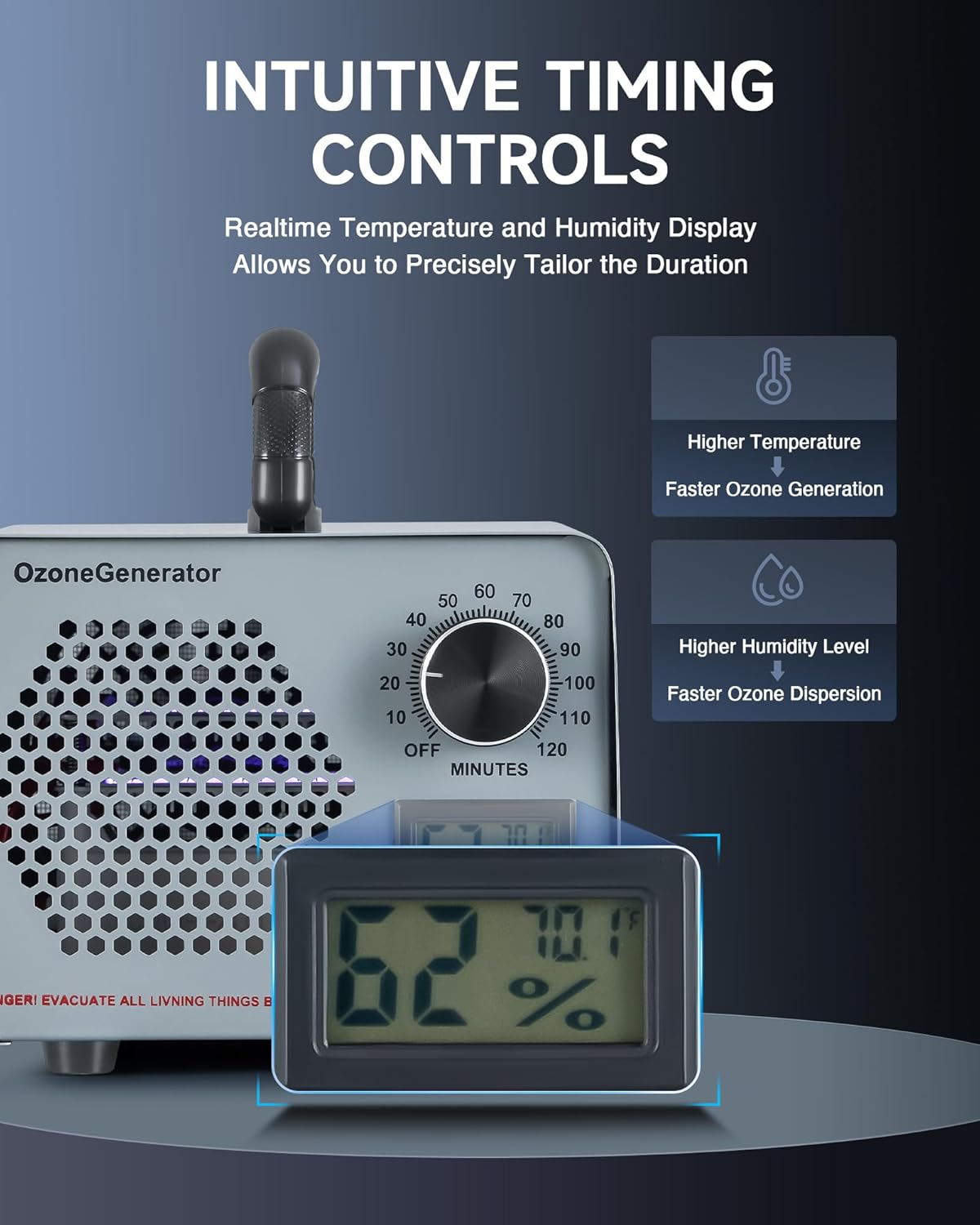 - Powerful Deodorization: With a maximum ozone output of 60,000 mg/h and a 2800 rpm fan, this ozone machine can effortlessly deodorize a space of up to 3200 square feet