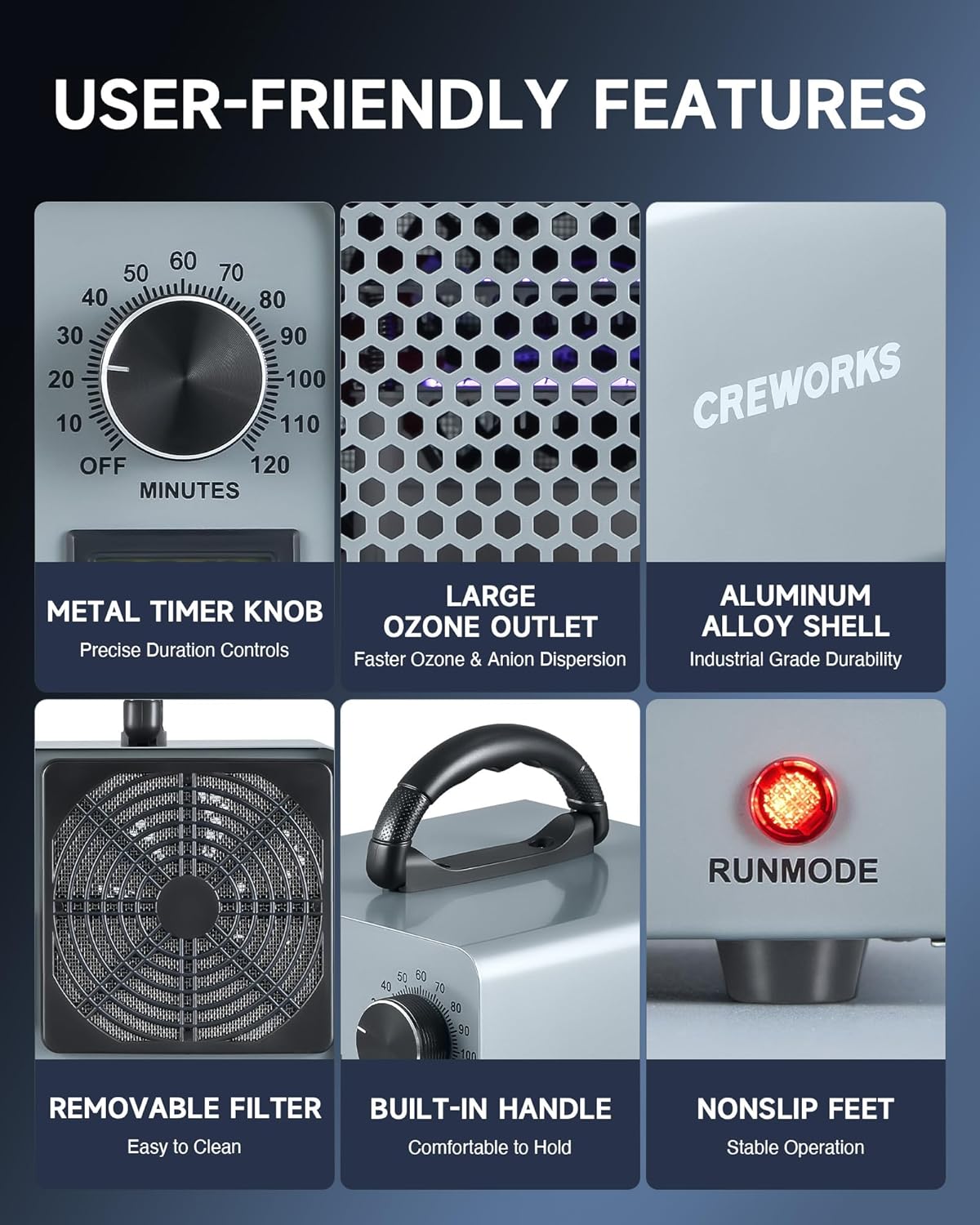 - Comprehensive Air Purification: This Creworks ozone generator quickly produces a sufficient amount of O3 molecules to let them interact with various pollutants and airborne contaminants, eliminating tough odors at the source instead of masking them