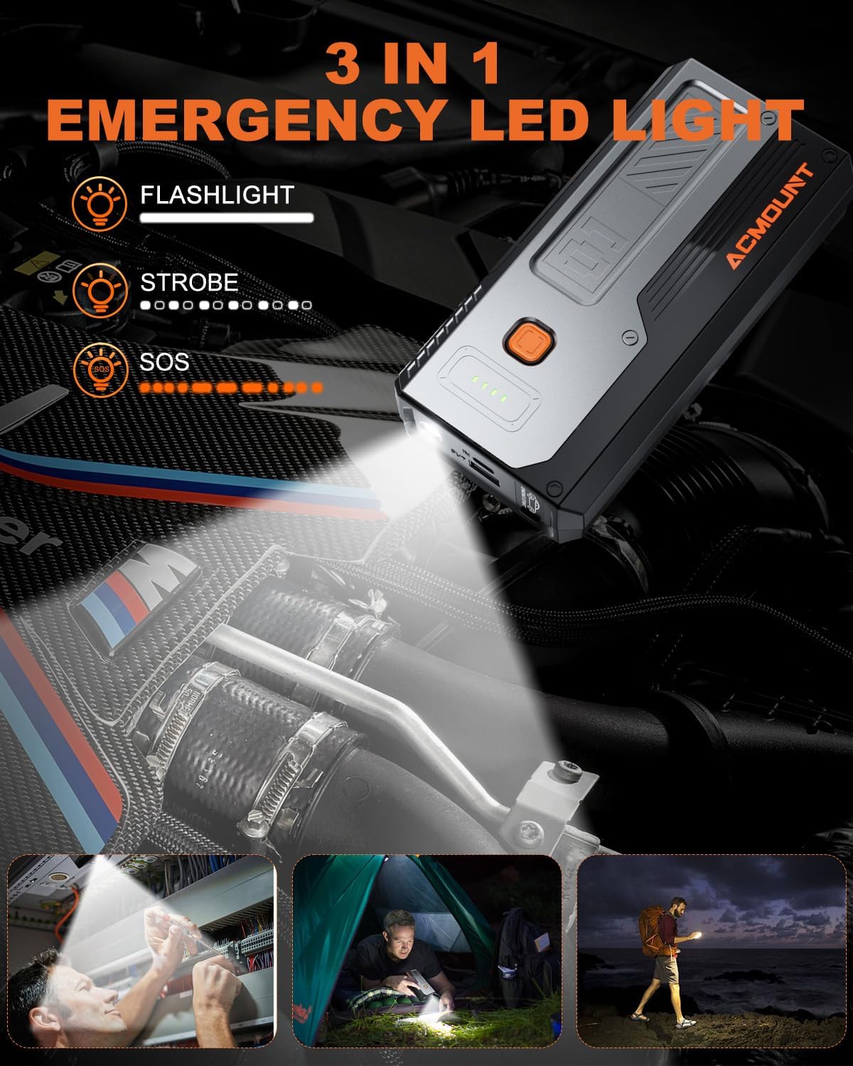 - What U Will Get: Acmount J450 Jump Starter, Smart Jump Cables, USB Type-C Charging Cable, Storage Bag, User Manual; 24-Month Warranty and Life time reliable Technical Support. Any questions about product, contact us and you will get a satisfactory solution.