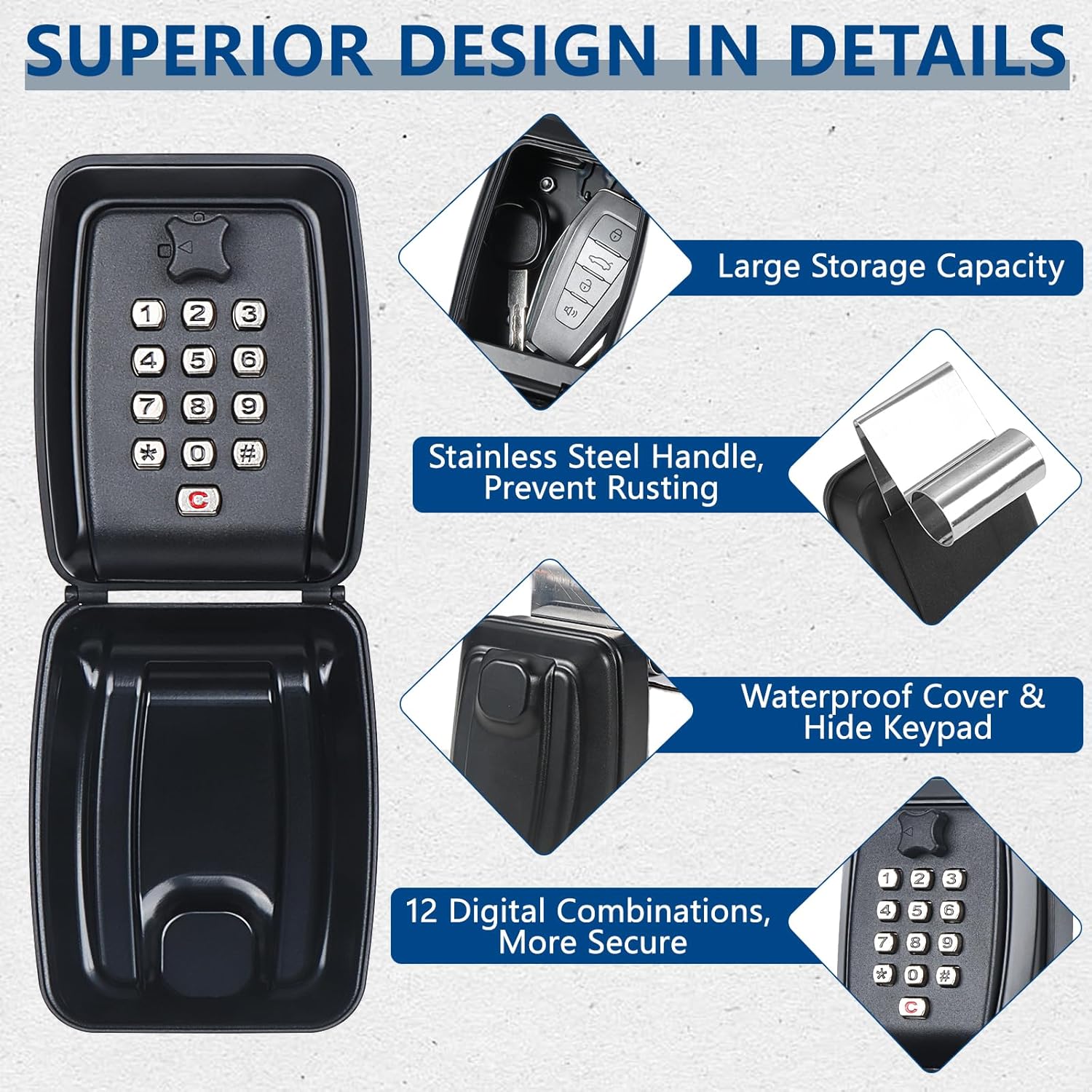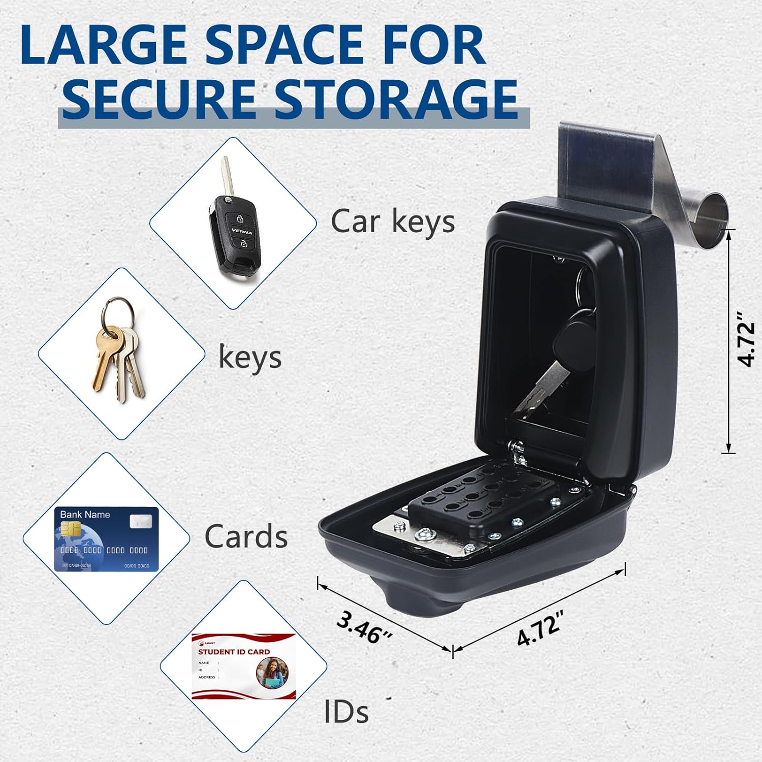 - 【Easy Installation and Use】Our key lock box comes with a back hook and screws, so you can hang it on the car window or fix on the wall. It has a 12-digital password keypad featuring thousands of combinations for maximum security. (Note: 1.Please take a photo record or record with a note after setting a new password, forgetting the password will make it unusable. 2.It's not suitable for vehicles with keyless access as the lock box doesn't block the signal. If you would like to try, you could try to line the inside of the box with tin foil).