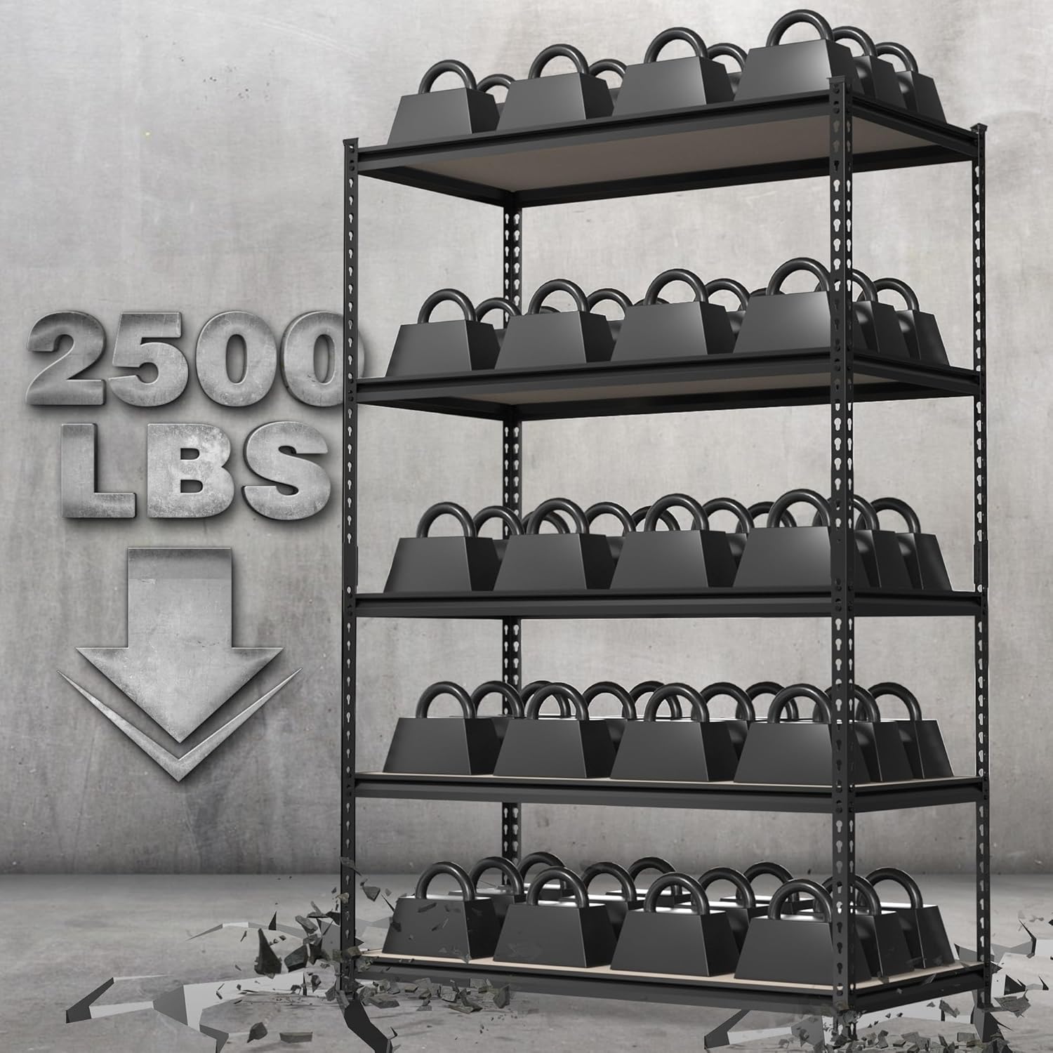 - 【2500 lbs Load Capacity】Made of high-quality metal frame and particle board, this shelving unit is more steady and tough than normal garage shelves. The maximum capacity is up to 2500 lbs total, 500 lbs per shelf, which can store much more stuff and tools in your garage or warehouse.
