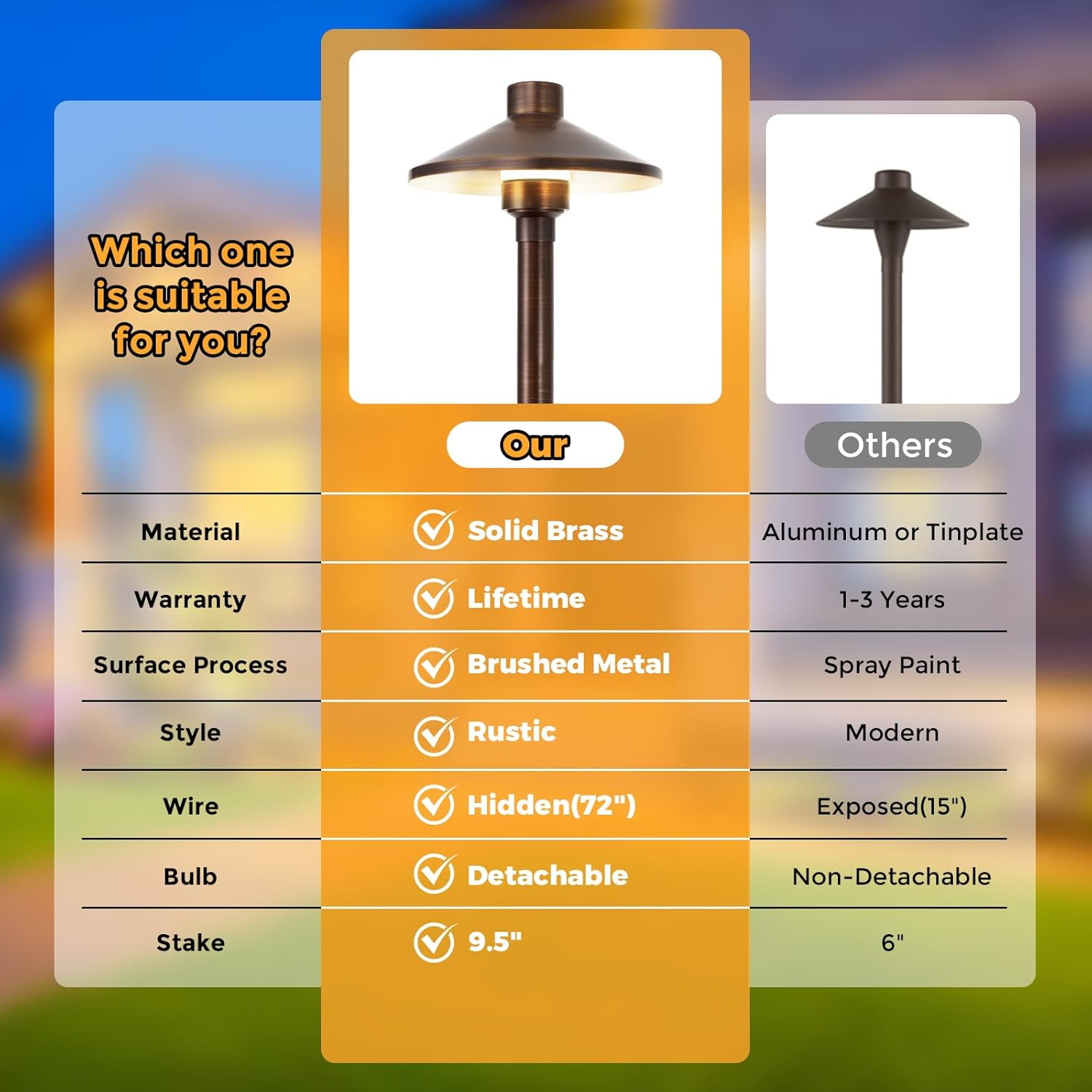 - FULL BRASS HOUSING AND LARGER ABS STAKE: New and improved design from Gardencoin, 63% copper, heavy-duty construction, strong and durable landscape path light with large ground stake to keep it upright and not tilted