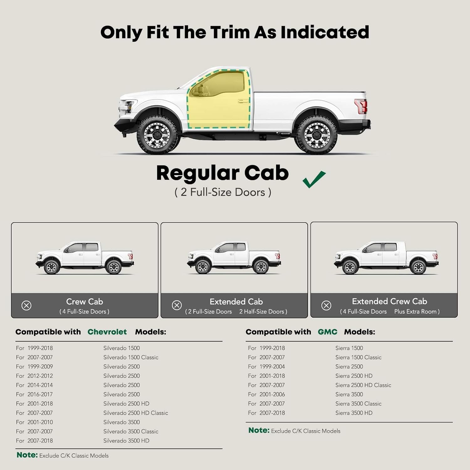- Confident Fitment: Cab length side steps fit the Chevrolet GMC Models: Silverado/Sierra 1500 99-18, 2500 HD 01-18, 3500 Classic 07, 3500 HD 07-18, Silverado 2500 99-17, Sierra 2500 99-04, Silverado 3500 01-10, Sierra 3500 01-06, Standard/Regular Cab(2 Full-Size Doors)