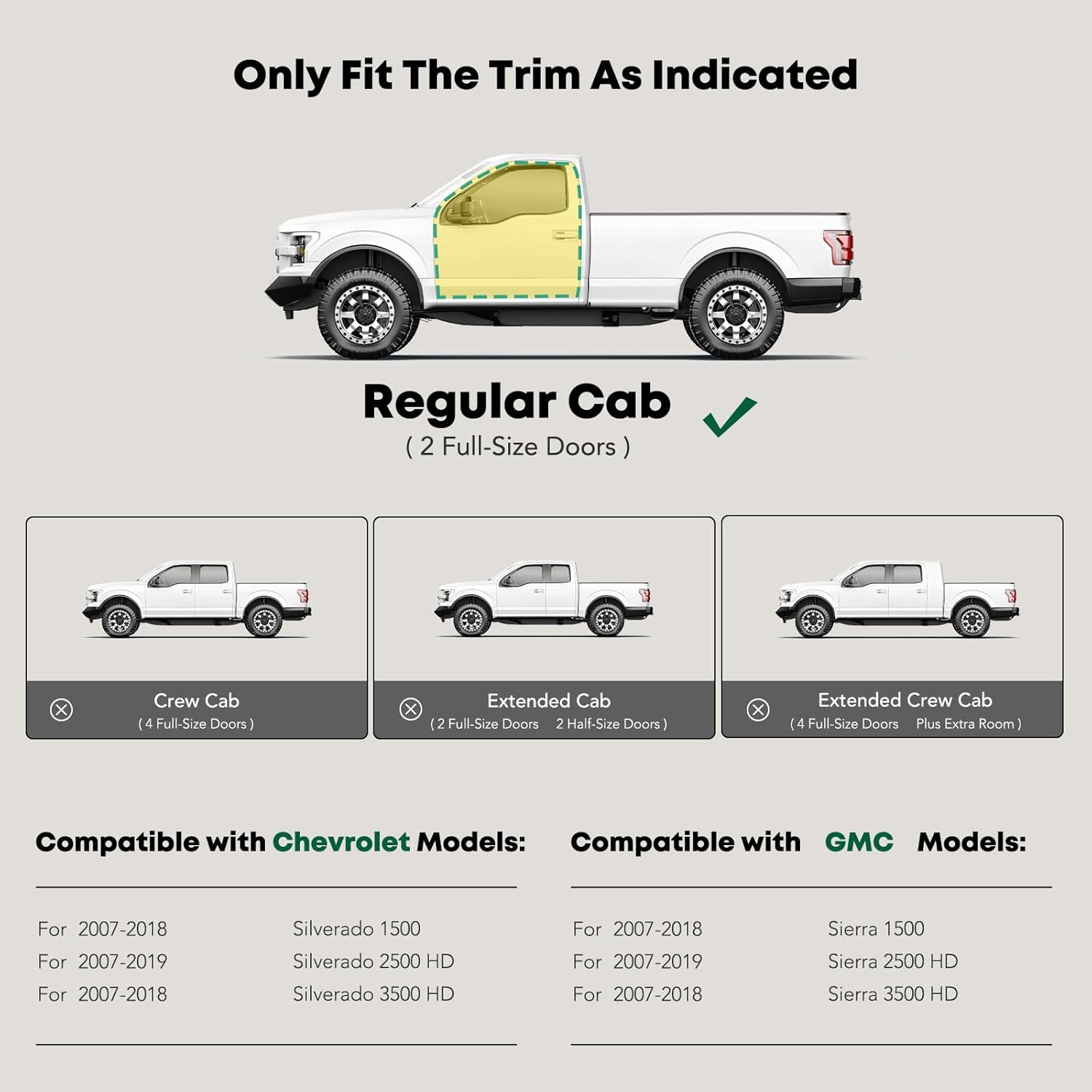 - Perfect Fit Side Bar: Our cab length running boards are fit for Chevrolet and GMC Models: Silverado/Sierra 1500 2007-2018, Silverado 2500 2007-2018, Silverado/Sierra 2500 HD 2007-2019, Silverado 3500 2007-2010, Silverado/Sierra 3500 HD 2007-2018---Standard Cab/Regular Cab (2 Front Doors). YHTAUTO are committed to creating an all-around quality side bars that do more than just make it easy for you to get in and out of your car, or just complement the factory curves of your vehicles