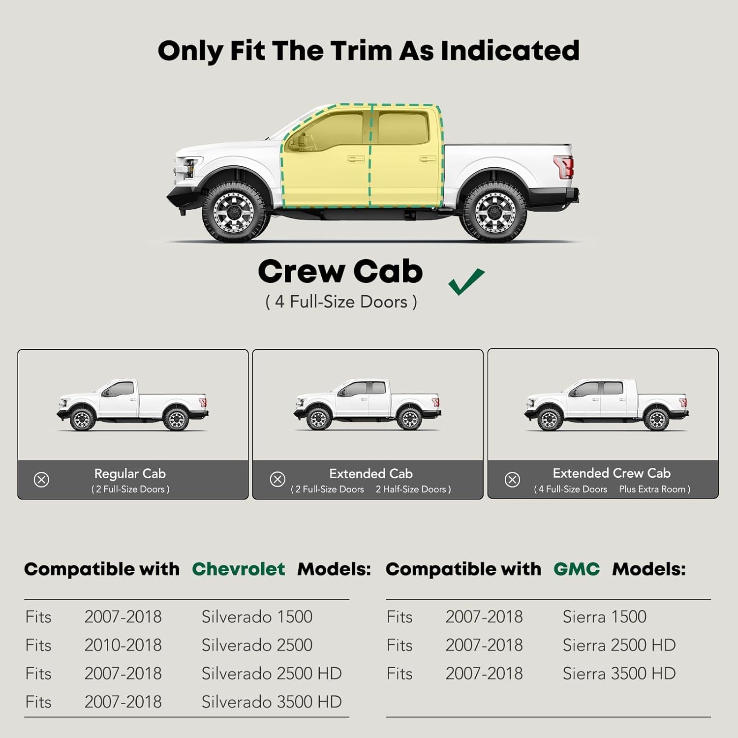 - Confident Fitment: Cab length side steps are compatible with the Chevrolet and GMC Models: Silverado/Sierra 1500 2007-2018, Silverado/Sierra 2500 HD 2007-2019, Silverado/Sierra 3500 HD 2007-2019, Crew Cab(4 Full-Size Doors), Not Fit Diesel Models with DEF Tanks