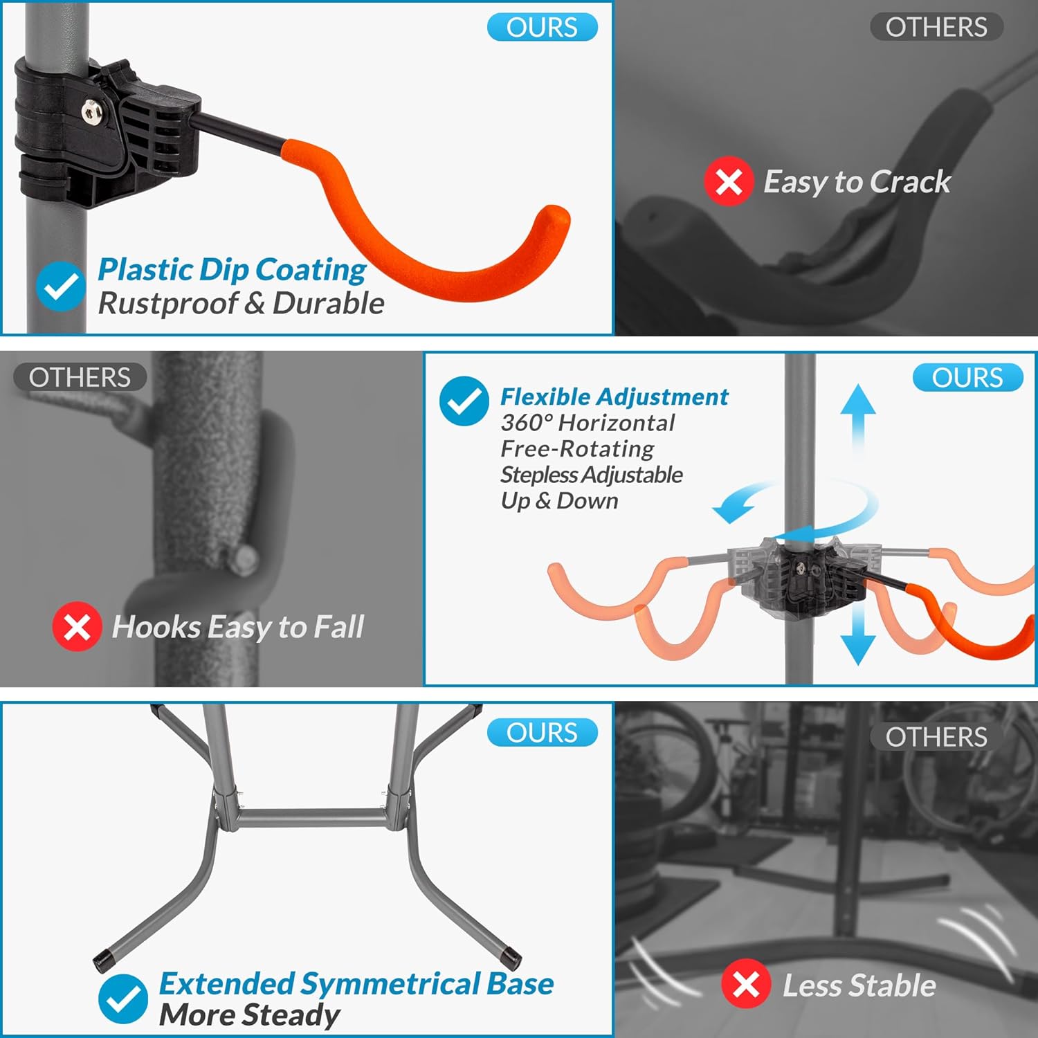 - Easy to Install and Use: After the simple installation, just place the bike stand to where you need, then adjust the support arms to suitable position and balance the bicycles on the arms to use. Rubber anti-slip pad on the bottom feet prevent tipping, enhancing safety. Moreover, this bike storage rack comes with pre-drilled holes and screws, making installation effortless. With the help of the instruction manual, you can easily assemble it and enjoy the process.