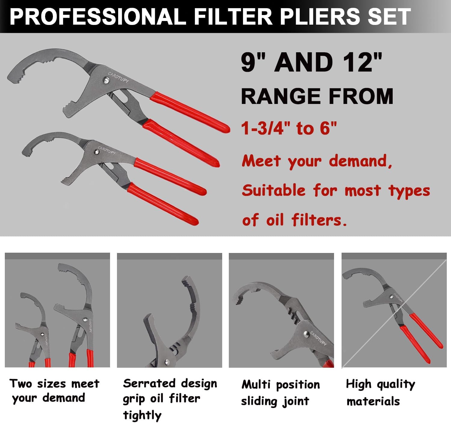 - Multipurpose Tools: The sizes of oil filter wrenches range from 2-1/16" to 5-1/4", and the adjustable oil filter pliers include 9" and 12" fit filters from 1-3/4" to 6", The 3 jaw wrench djustable from 2-1/2", These tools are designed to provide you with a complete set of tools for removing oil filters on various vehicles.Whether you're a professional mechanic or a DIY enthusiast, this oil filter wrench set is a must-have tool for your garage or workshop.