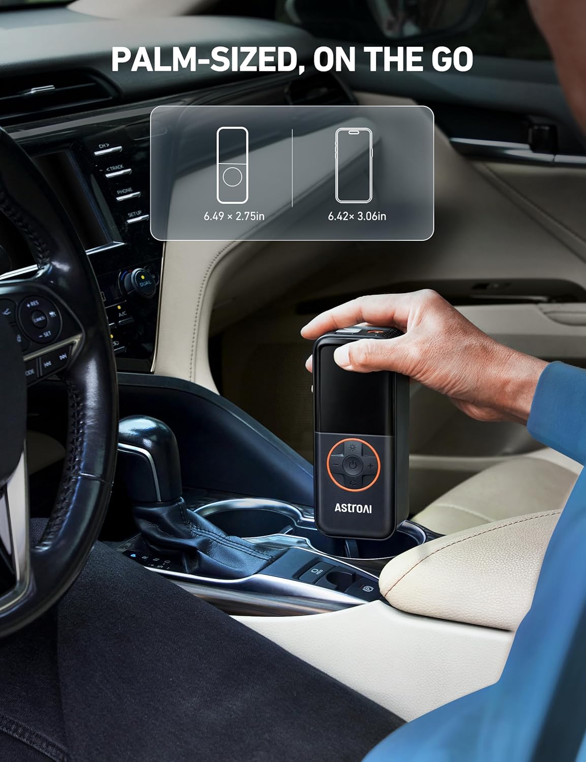 - PALM-SIZED, ON THE GO: Measuring just 6.49*2.75*1.96 inches and weighing just 1.12 pounds, the AstroAI L4 tire inflator portable air compressor is handheld, allowing it to perfectly fit in glove boxes or garages, and be taken anywhere. With the included quick connector, you can easily snap it onto the valve and enjoy one-step inflation wherever you roam.