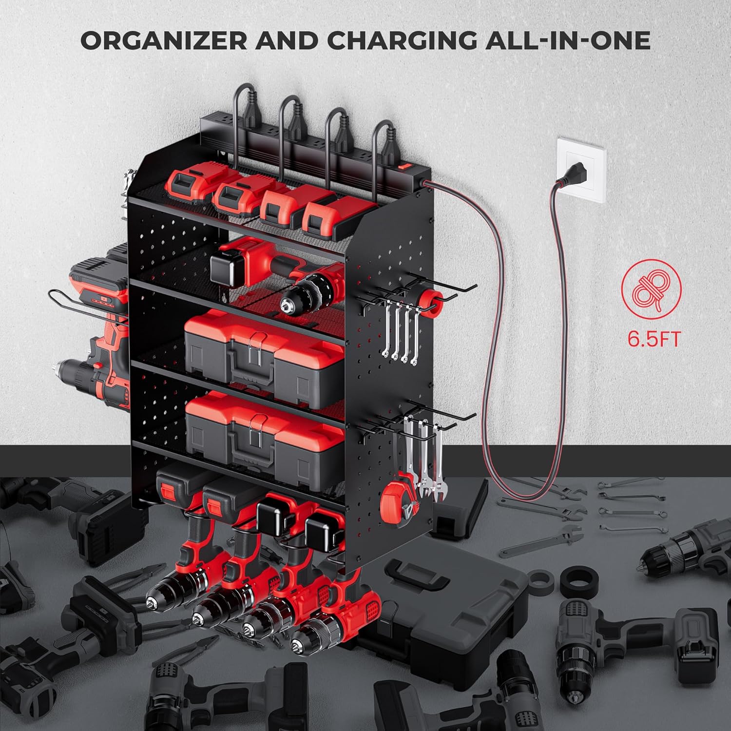 - 5-Layer Efficient Storage: First layer for rechargeable tool organization, middle three layers provide space for garage tools, bottom layer for 4 cordless drills, side pegboards include drill bit rack, 4 long hooks, and drill rack for 2 drills