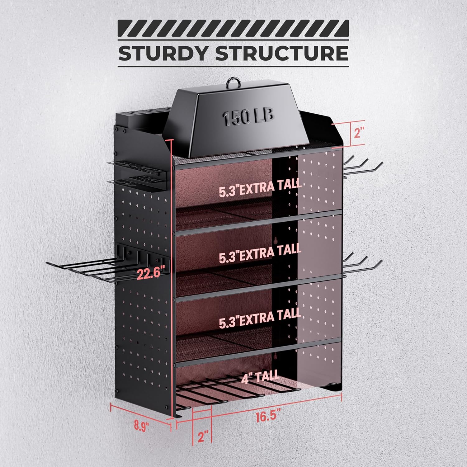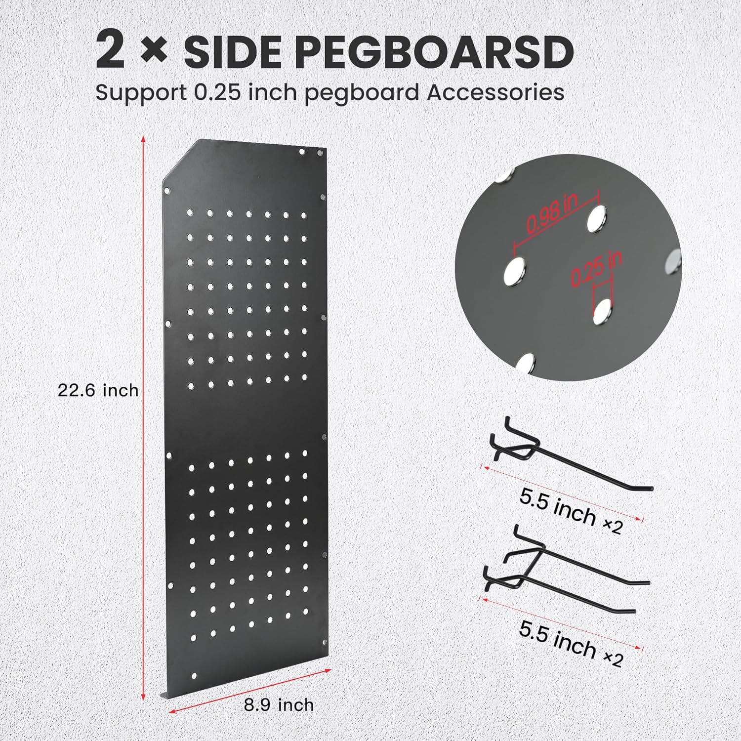 - Versatile Side Pegboards: Hang garage tools on 8.9"W × 12"L side pegboards with included long hooks, drill bit rack, and cordless rack, supports 0.25" pegboard organizer accessories for DIY customization