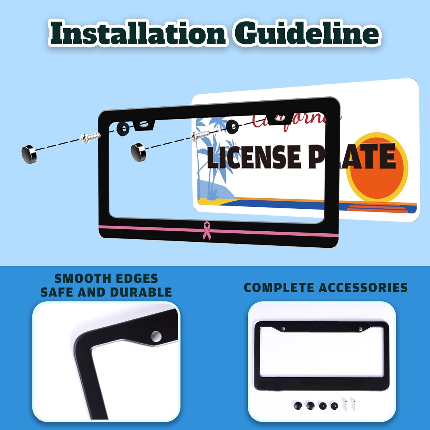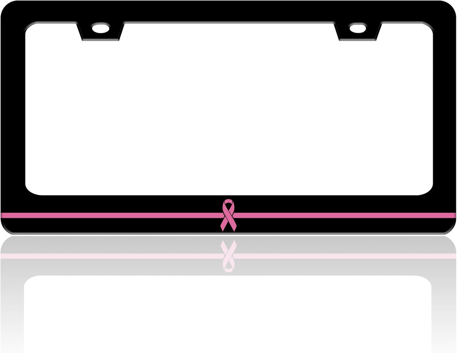 Breast Cancer Awareness License Plate Frame Pink Ribbon License Plate Holder for Front or Rear Car Tags Stainless Steel Funny Car Decoration with Screws 6.3 X 12.2 in