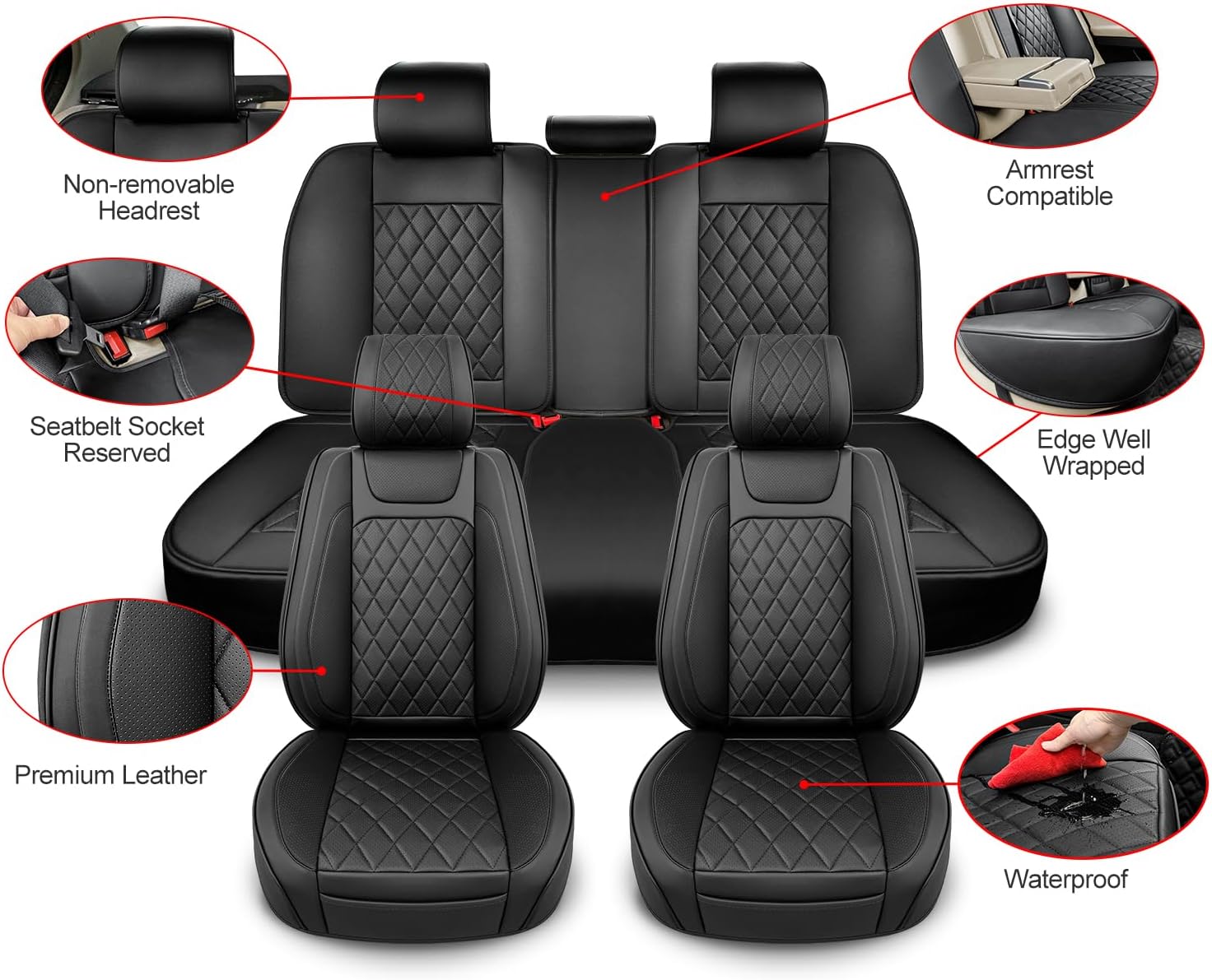 - 360 Degree Full Surround: Full set leather car seat cover protector is designed with 360 no-dead-angle full wrapping design. The side car seat cover is also protected by a full leather cover.The top of the car seat cover is completely wrapped with a snap design.Compared to other car seat covers with exposed sides and top, our full surround car seat cover greatly improves aesthetics and practicality.