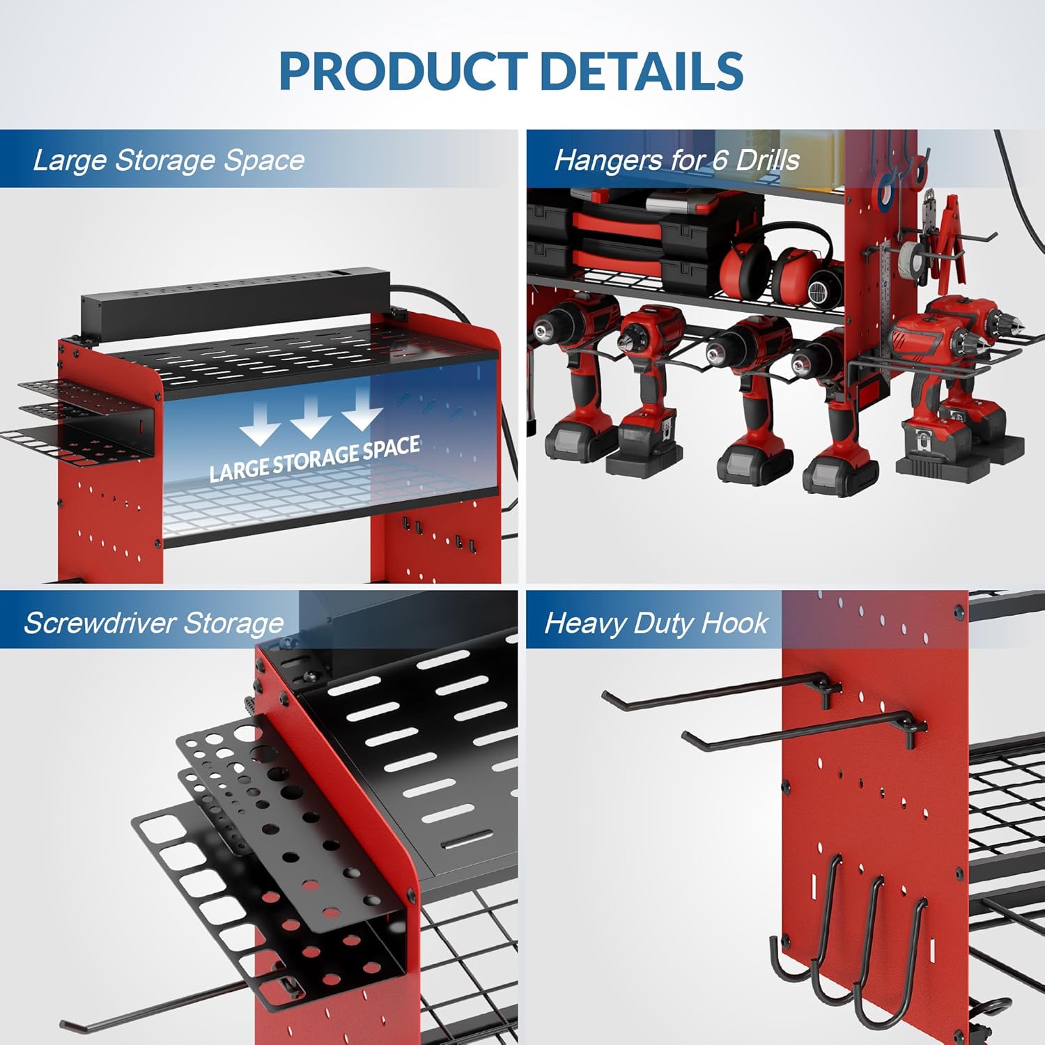 Power Tool Organizer with Charging Station, 4 Layers Garage Storage Rack with 6 Drill Holders, Father's Days Gift For Dad, Wall Mount Garage Organizer Built in 8 Outlets Power Strip, Red