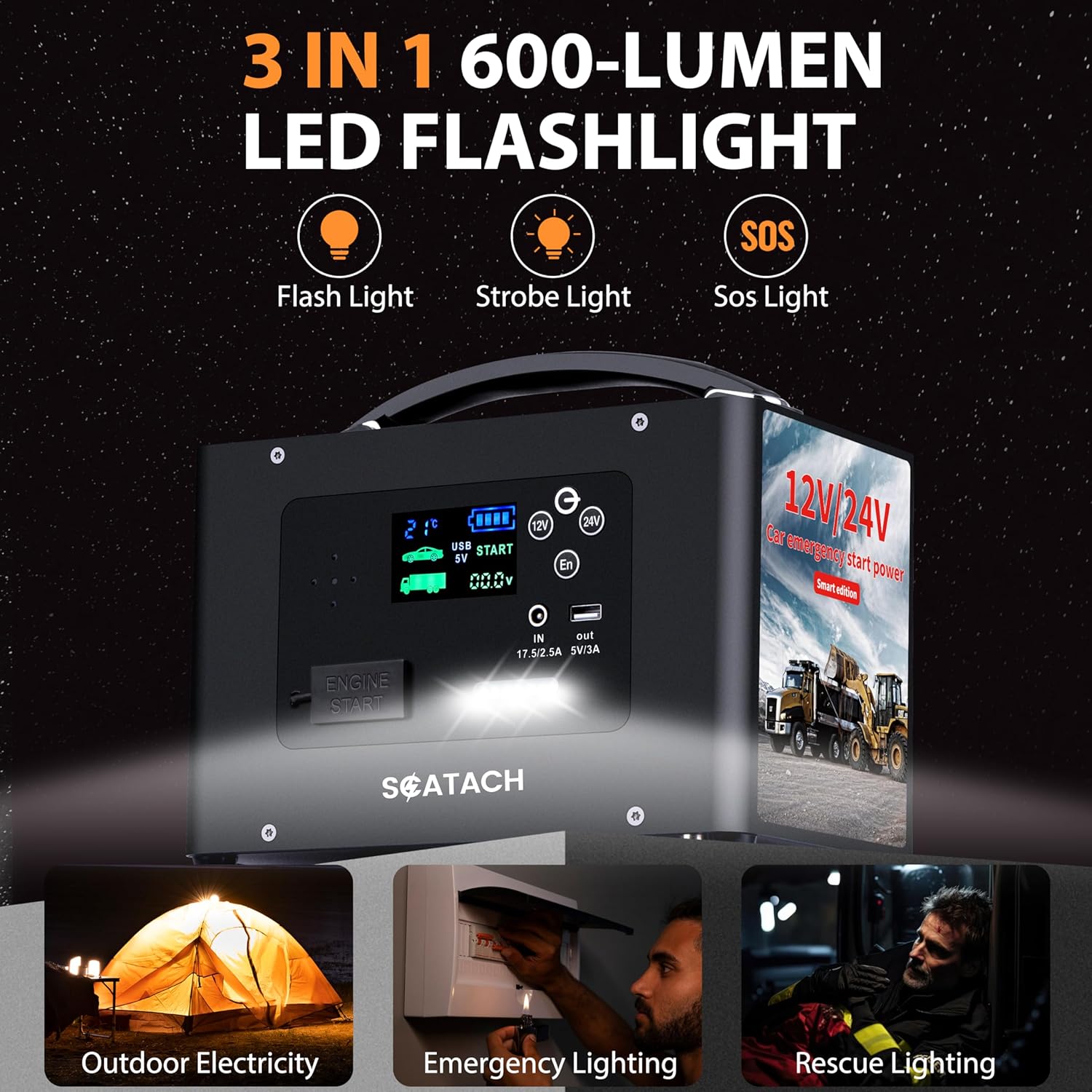 - LED Lights: Portable heavy duty jump starters design makes it perfect for on-the-go use, making it a must-have accessory for any vehicle owner.The built-in ultra-bright 400 lumen LED light offers three modes: illumination, flash, and SOS, providing light and emergency signaling capabilities.