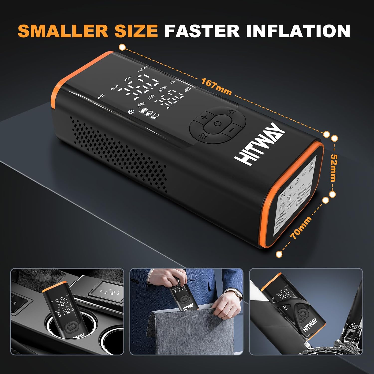 HITWAY Portable Electric Inflator Pump Supports up to 150PSI, fast inflation, suitable for car, motorcycle, bicycle tires and sports equipment, LCD display screen, USB charging, built-in LED light