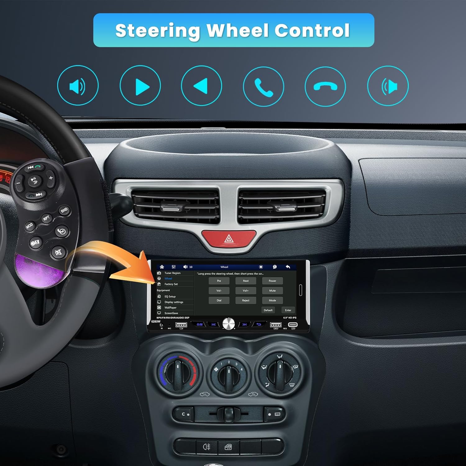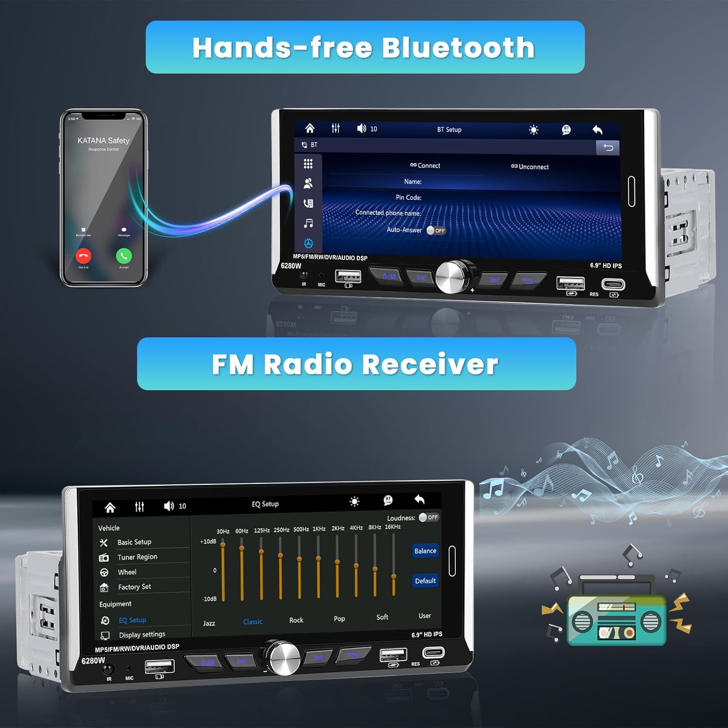 - 【Wireless Carplay, Android Auto & Mirror Link】Using Wireless Carplay Android Auto via Bluetooth, you can access your phone contacts, notifications, map navigation, music, videos and more. Direct USB connection mirrors your smartphone display (iOS/Android) to the 6.9-inch HD car radio screen in real time, allowing you to share your phone content with your family on the screen
