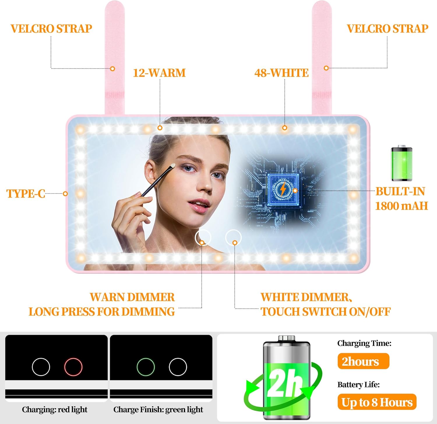 - USB POWER SUPPLY AND BUILT-IN LITHIUM BATTERY: The car mirror is powered by lithium battery or USB cable, which can be charged through the socket, computer, mobile power, free to use the vanity mirror with lights at anywhere and anytime. 2000 mAh rechargable battery we used You could use it for 8 hours without charging it, Calculated by using 30 mins per day, the lithium battery can be used for at least 10 days with one charge