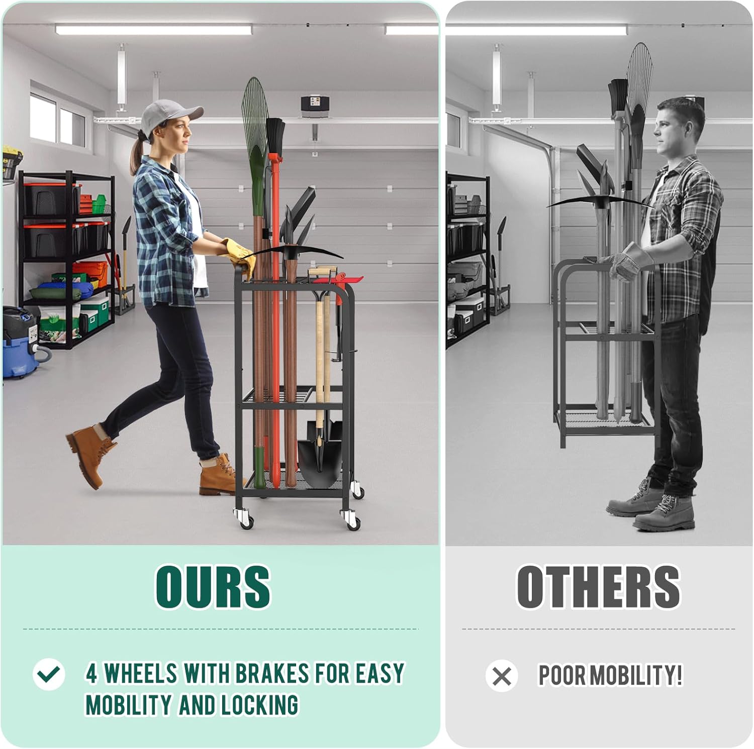 - Use Various Case: The purpose of producing the garden tool organizer is to store garden, yard and lawn tools, so it can store but not limited to broom, mop, rake, tongs, shovels and other tools, because it carries wheels, so it can be easily applied to the garage, garden, shed and backyard, using it can make the whole space more orderly and tidy, look less cluttered. Not only does it feel comfortable but it also improves space utilization.