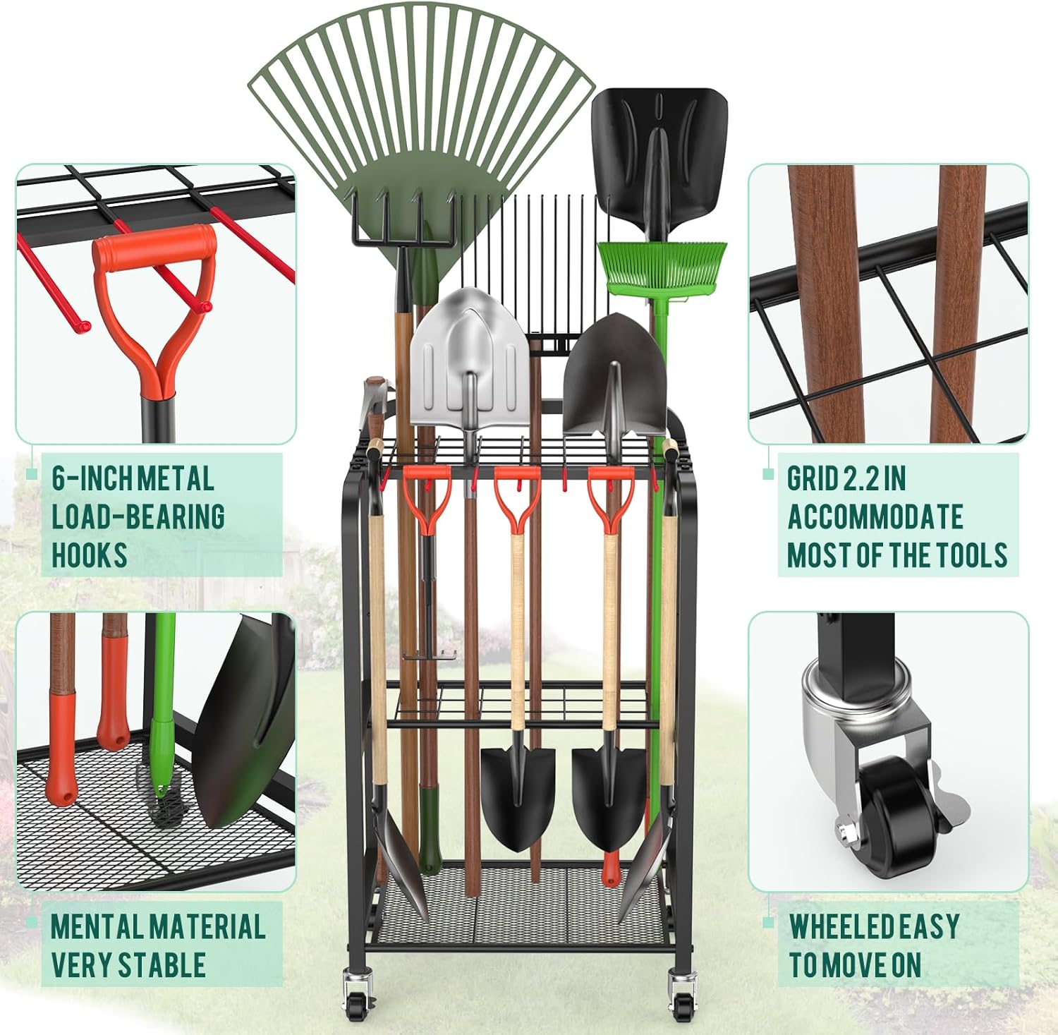 - Super easy to use with wheels: Our garden tool organizer features 4 wheels with a diameter of 1.5 cm, that can easily moved without effort. So you can easily to clean the floor or move to another place. All metal design offered a better load bearing capacity, and durable of course.