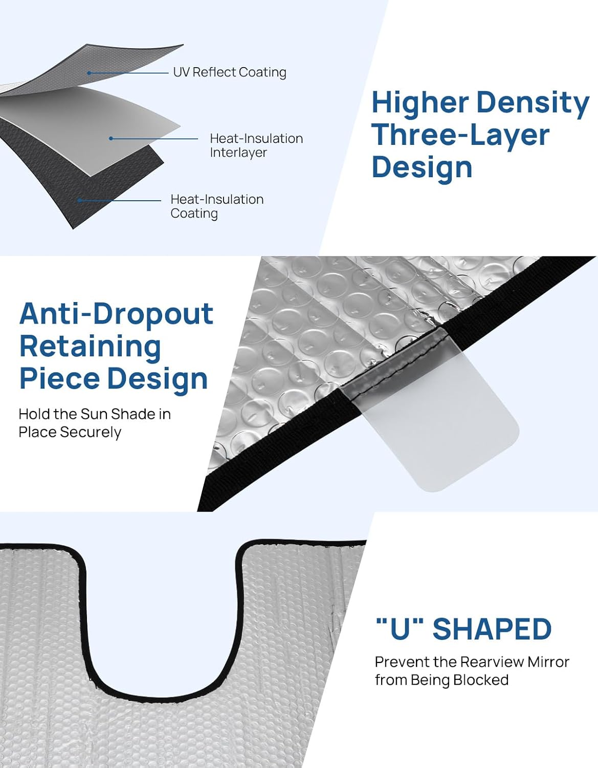 - SUPERIOR MATERIAL - Windshield cover sun shade is made of high-density heat-insulating material with UV reflective aluminum coating, protecting your car from the sun's heat and harmful UV rays effectively.