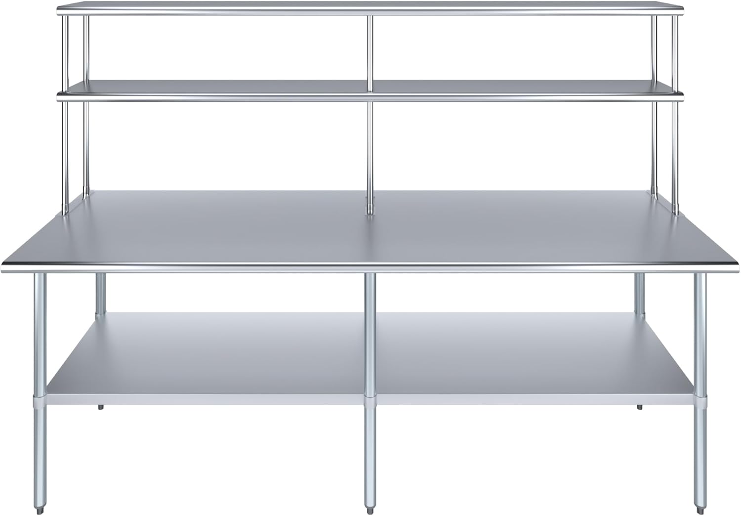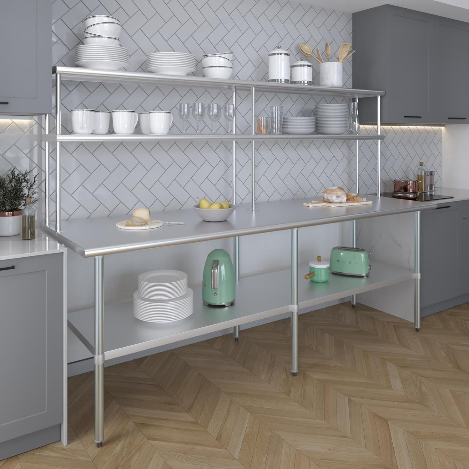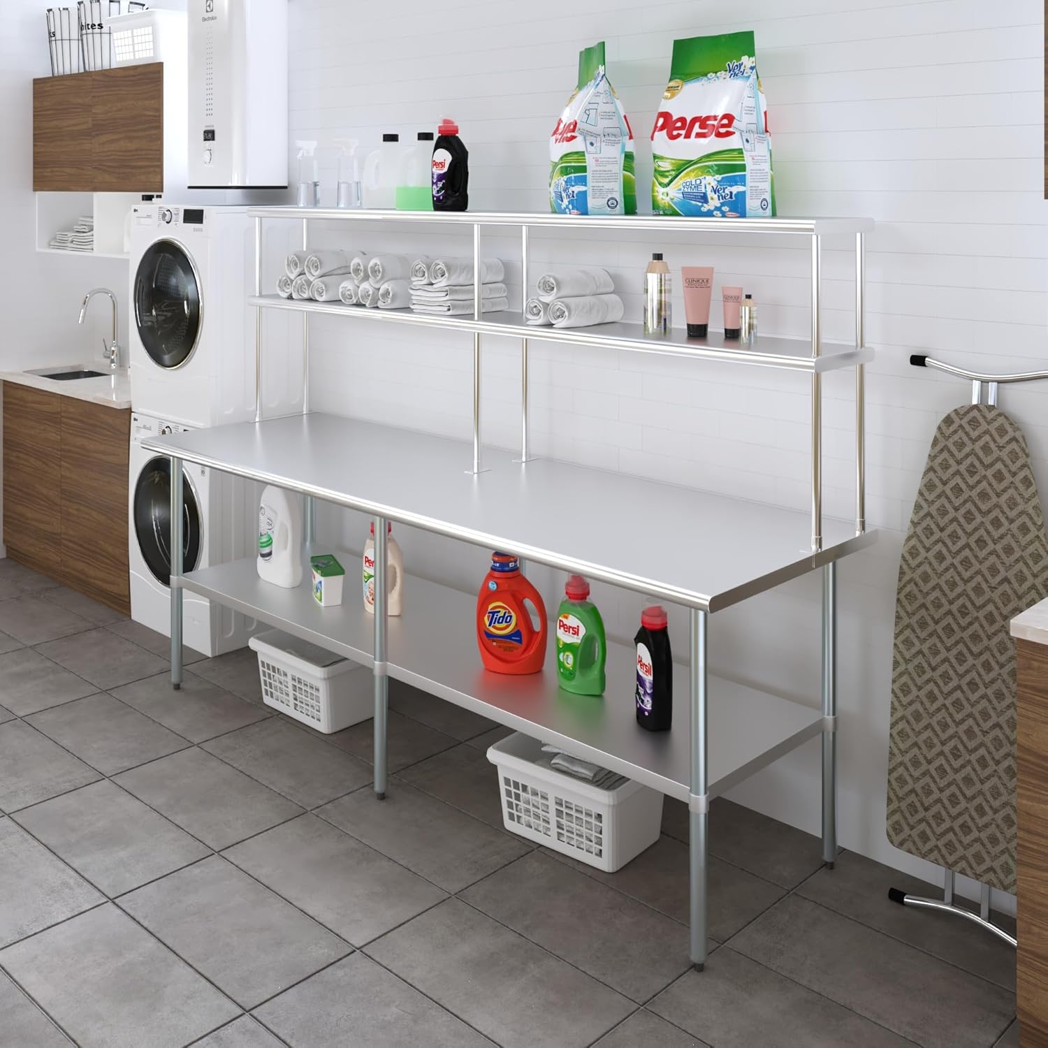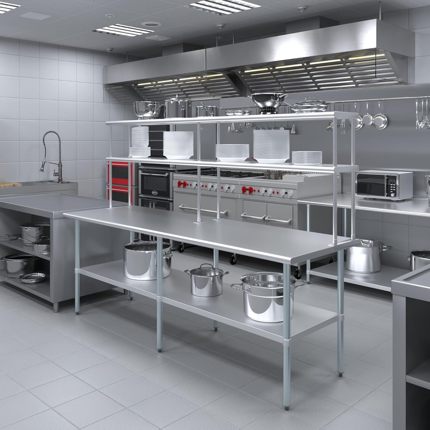 - WORK SAFETY: Work table top and double tier adjustable shelves are constructed from 18-gauge stainless steel, making this restaurant prep and serve table and double tier shelf combo set is durable and long lasting. The table top comes with a galvanized under-shelf for additional storage and adjustable legs for convenience. This table and shelf set is specifically designed and finished for use in a commercial or industrial setting, but is just as reliable in the home.