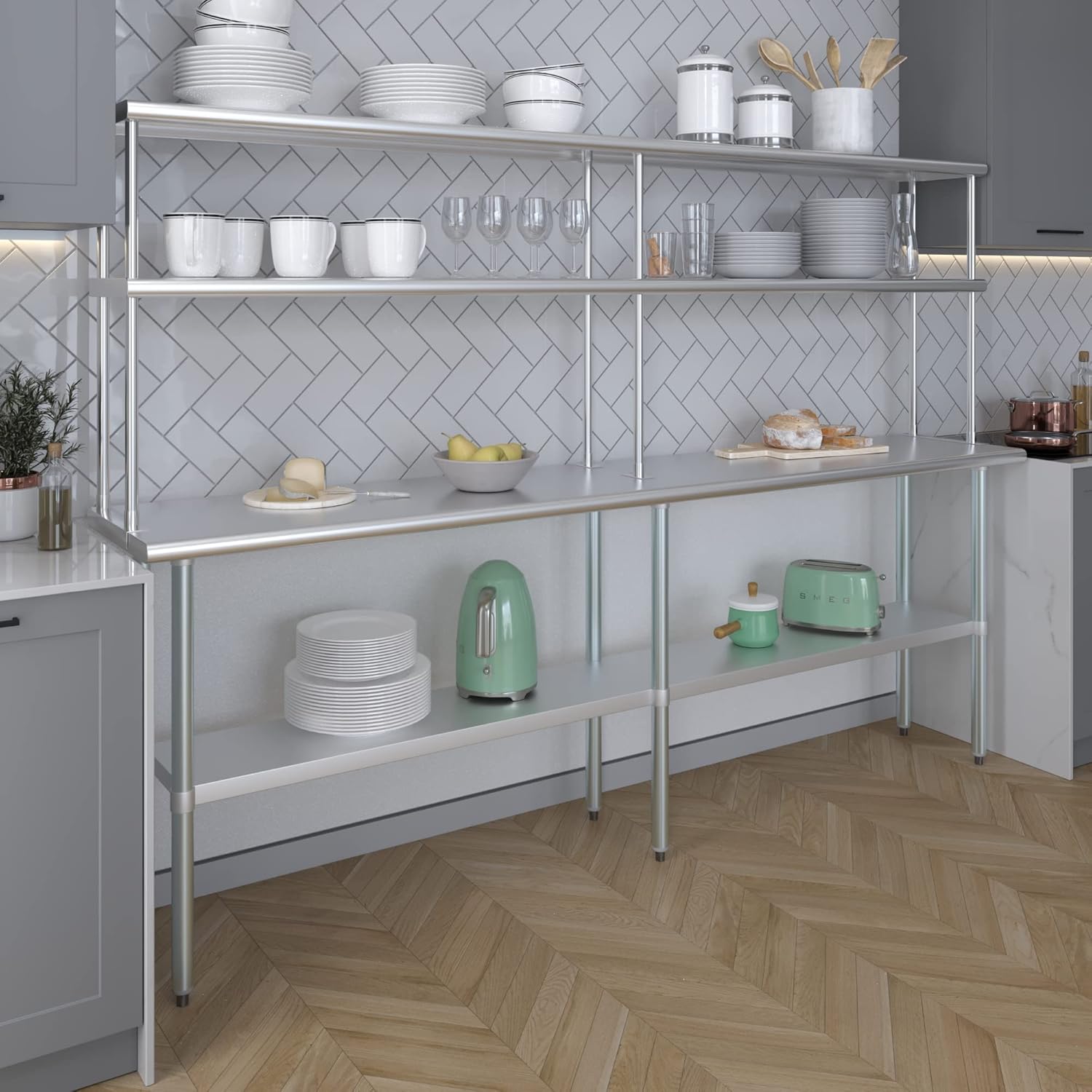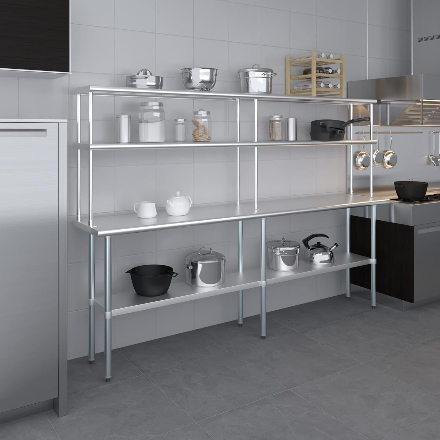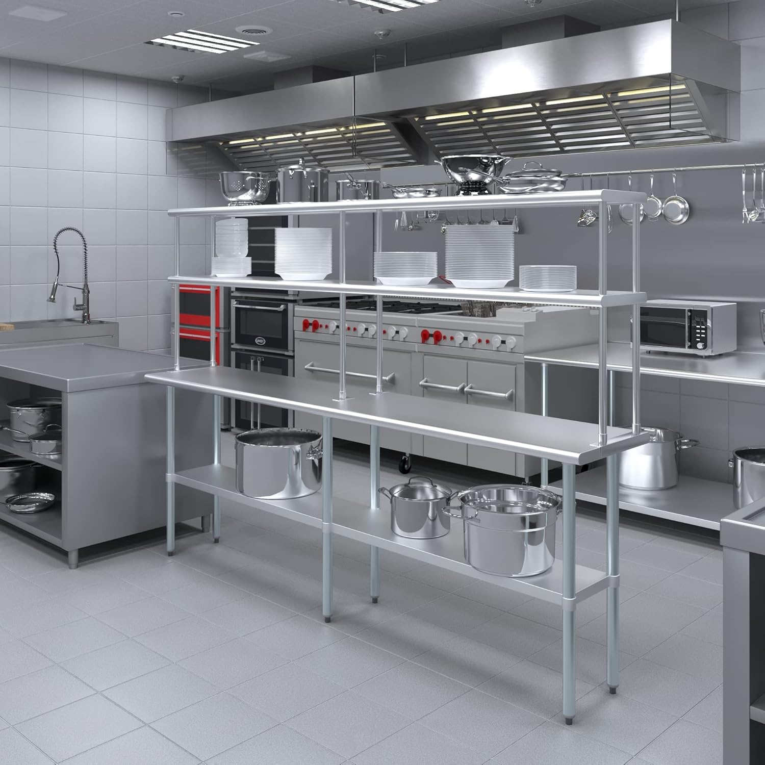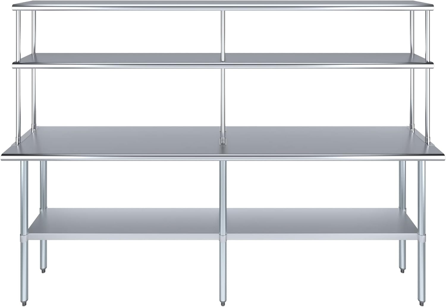 - WORK SAFETY: Work table top and double tier adjustable shelves are constructed from 18-gauge stainless steel, making this restaurant prep and serve table and double tier shelf combo set is durable and long lasting. The table top comes with a galvanized under-shelf for additional storage and adjustable legs for convenience. This table and shelf set is specifically designed and finished for use in a commercial or industrial setting, but is just as reliable in the home.