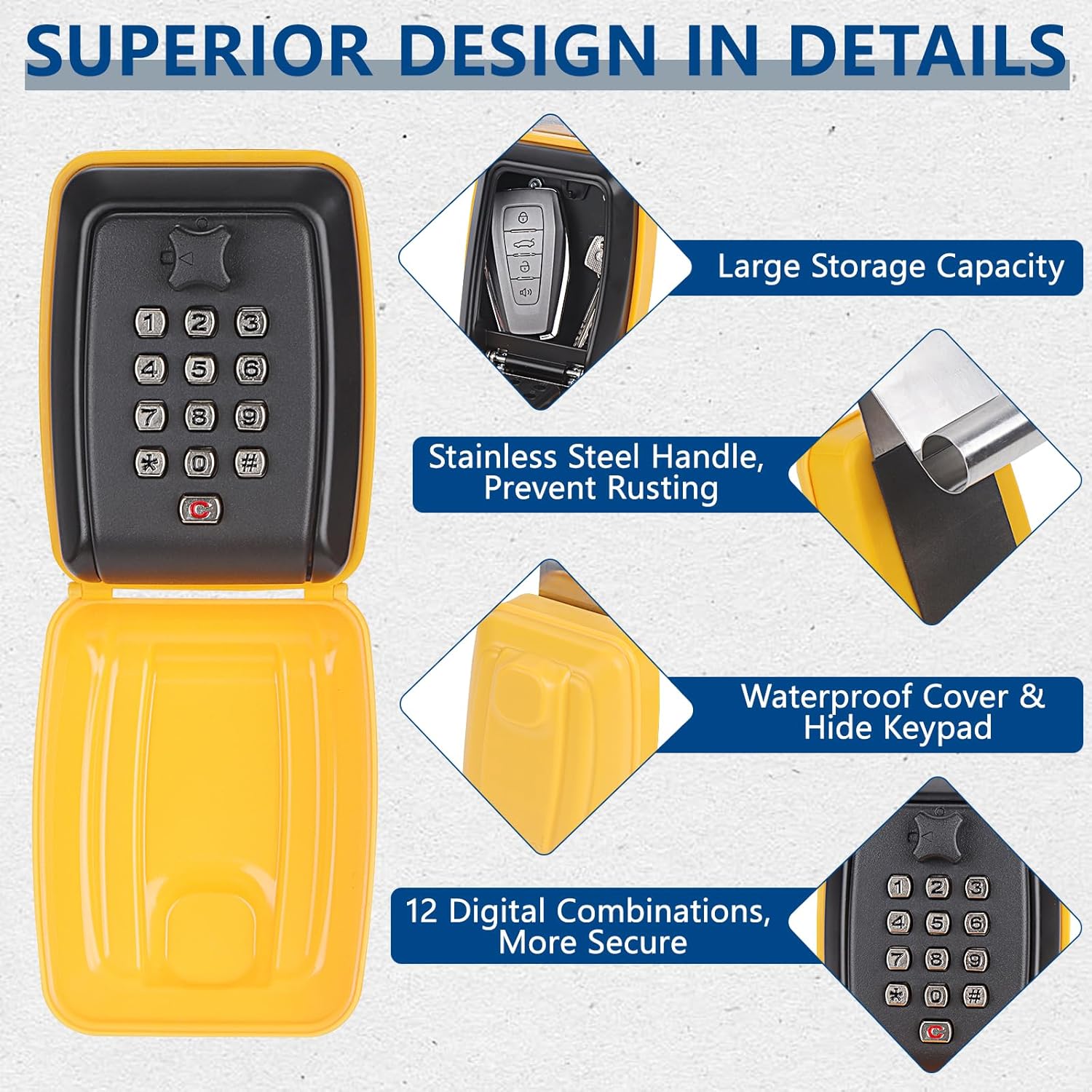 Car Window Punch Button Lock Box, Yellow Portable Car Key Lock Box with Key Labeling Tag, Sturdy Waterproof Large Capacity Lock Box for Turo, Ride Share, GetAround