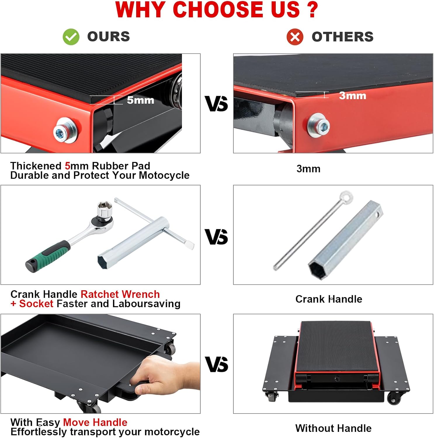 - Laboursaving : In addition to the crank handle,we also have an extra ratchet wrench,which is easier to use than crank handle,you will spend less effort to lift the motorcycle up quickly