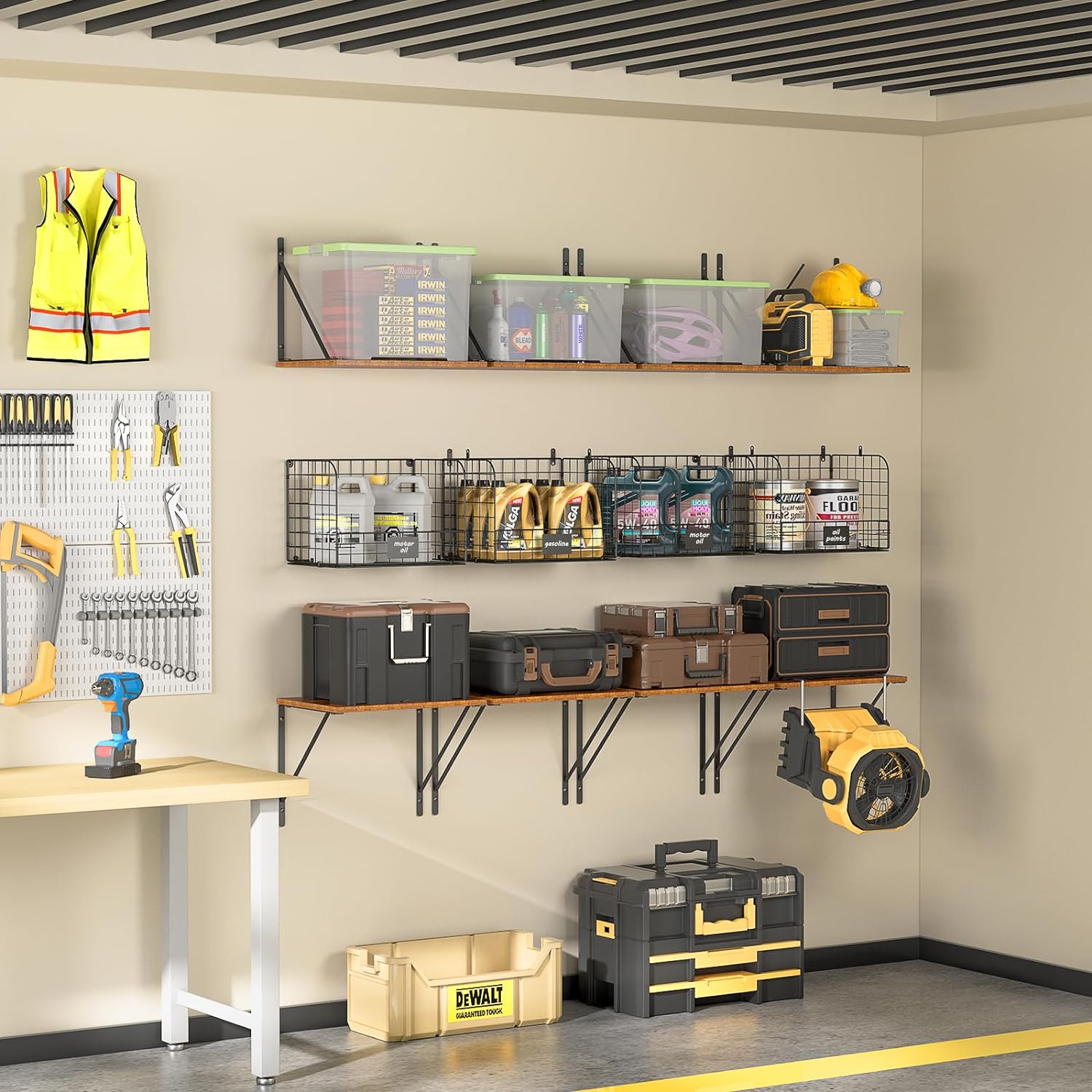 - Large Storage Capacity: The package includes 2 shelves, 2 wire baskets, 1 hook rack. This unique storage combination has a large enough capacity to store a lot of garage supplies. Making full use of this wall shelves capacity to make your home look cleaner and tidier.