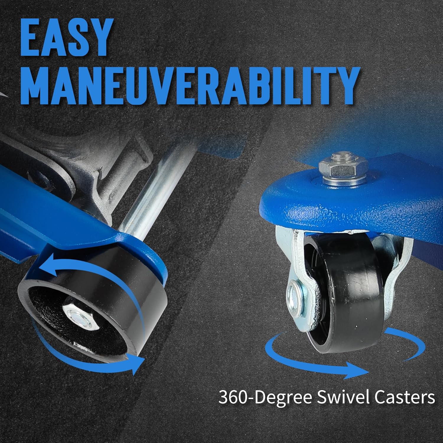 - Effortless Mobility: Outfitted with 2 large steel casters and 2 360-degree swivel casters, low profile car jack is easy to move around. The carrier handles and detachable long handle ensure easy transport to wherever you need it
