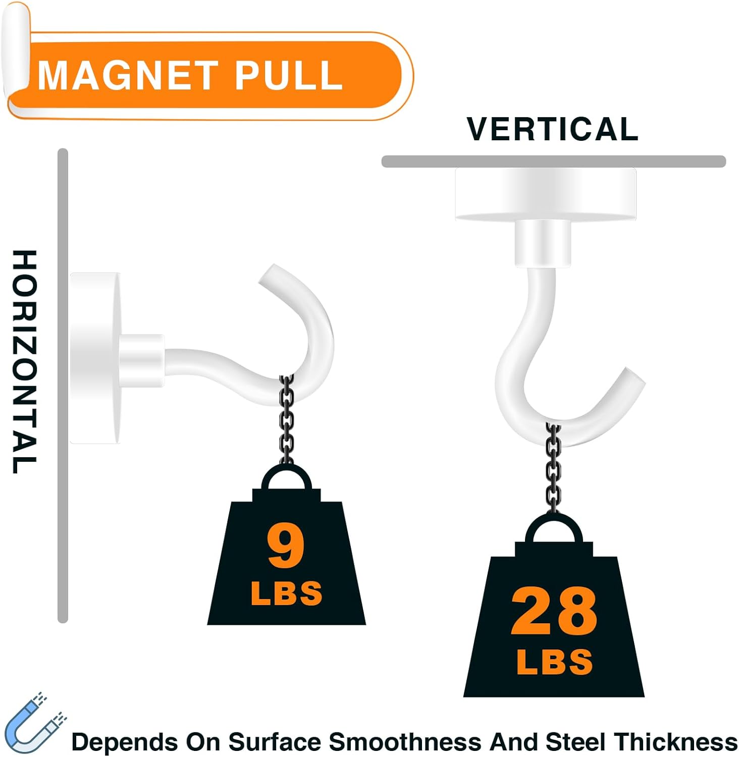 - 【Extra Magnet Hooks】- Get extra strong hold with our neodymium magnetic hooks! With over 28lbs of attractive force on horizontal surfaces, these magnetic hooks can securely hang heavy items. Even on vertical surfaces, the power of the magnets is still impressive, reducing by only 2/3. These sturdy and reliable hooks with strong magnets are the perfect solution for all your heavy-duty hanging needs.