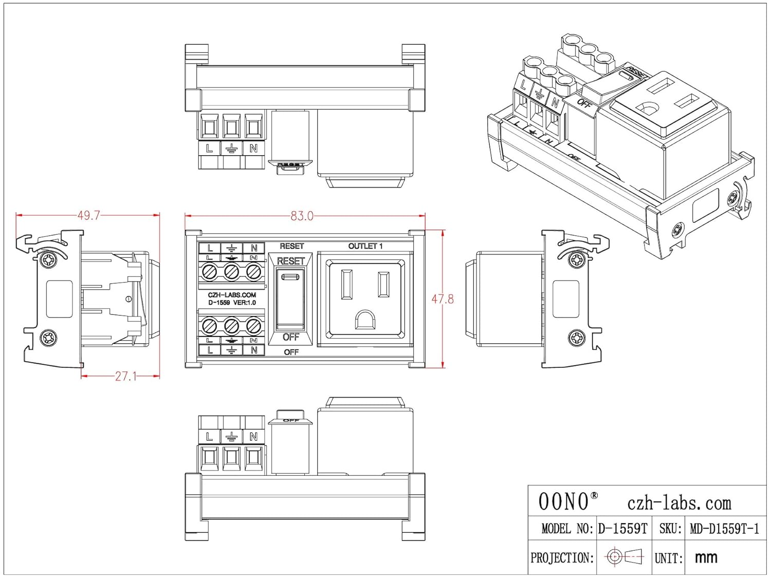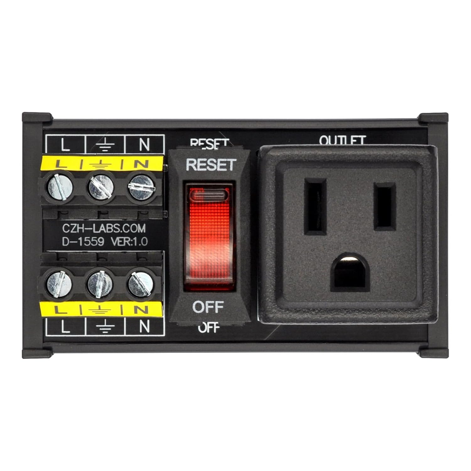 DIN Rail Mount AC 120V NEMA 5-15R Single Receptacle Outlet Power Strip Module, with Rocker Switch Thermal Circuit Breaker Overload Protector
