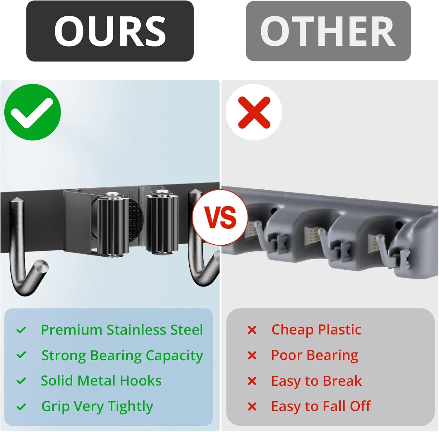 - 🏡【STURDY BROOM HOLDER】Each broom holder wall mount has 4 racks and 5 hooks. Our broom holder is made of sturdy 304 stainless steel which means it is corrosion-resistant, rustproof and waterproof. Compared with the plastic broom rack, our broom organizer is more stronger and has a longer service life.