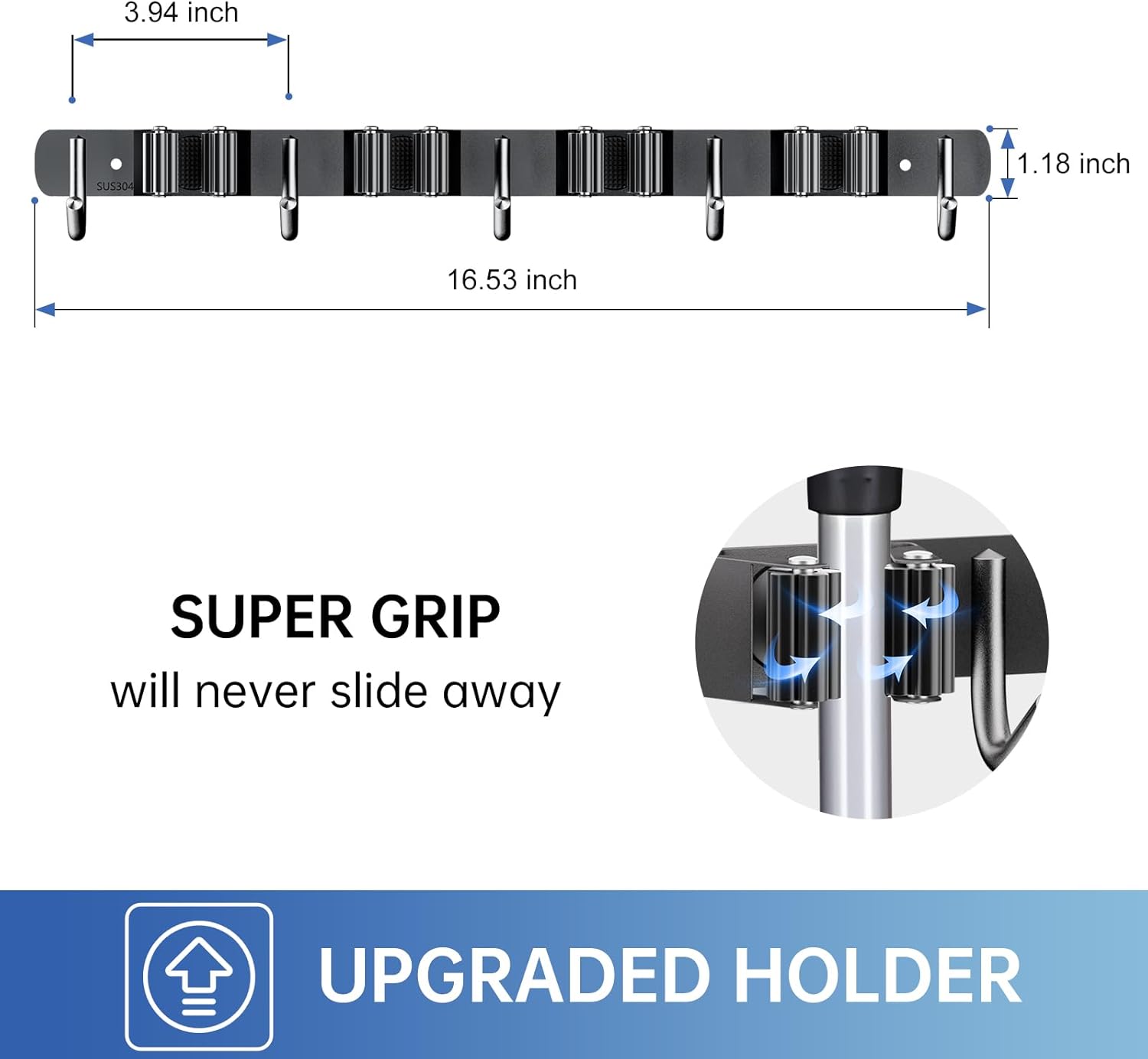 - 🏡【NON-SLIDE DESIGN】Each rack of the mop and broom holder wall mount features an adjustable triangular design. The spring-loaded, double rubber gripped slots can keep a stronger hold on your items with diameter of 0.7 inch-1.3 inch. Whether wet mops or baseball bats won't slip.