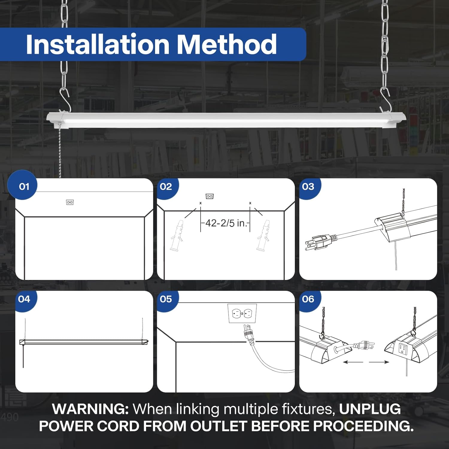 - Easy Installation: Simply plug in and enjoy brilliant illumination in your garage or workshop. provide exceptional brightness, energy efficiency, and a seamless installation experience.You can hanging it with the included hanging chains and mounting screws.