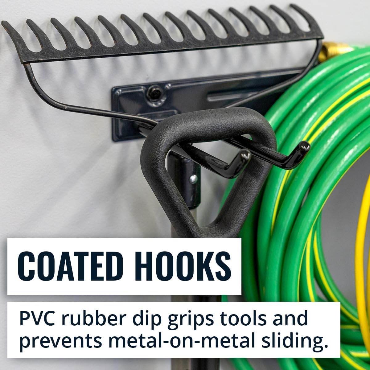 - RECLAIM YOUR GARAGE – Conquer clutter with this garden tool organizer designed for garage storage, sheds, or workshops. Measuring 36" L x 9.5" W x 2.5" H, it features four PVC-coated garage hooks and a 250 lb weight capacity, ideal for storing shovels, brooms, rakes, and power tools. Installs with 3 heavy-duty lag screws directly into 16" wall studs for secure, long-lasting support.