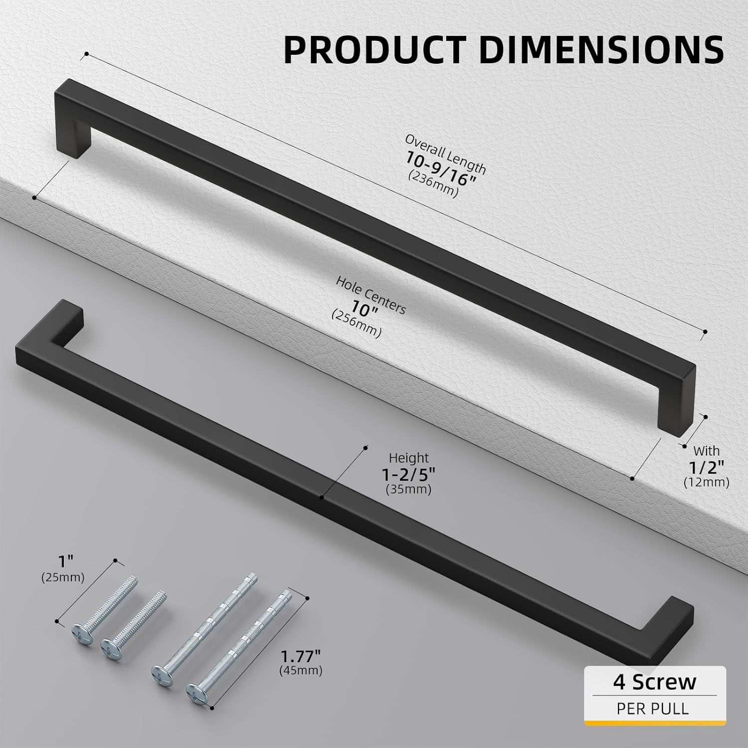 goldenwarm 150 Pack 10 Inch Black Cabinet Handles Matte Black Drawer Pulls Stainless Steel Cabinet Hardware Square Bar Modern Cabinet Handle for Kitchen Bathroom Cupboard