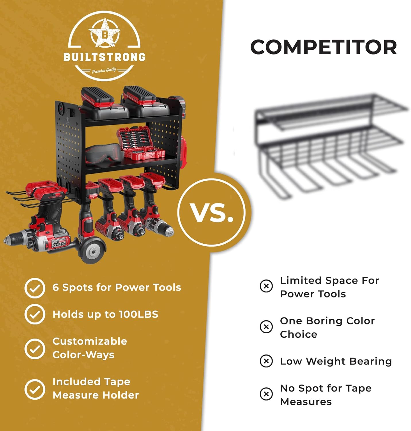 - PROFESSIONAL-GRADE DURABILITY let our tool organizers and storage shelves serve you for years on end. With a high-quality metal construction and beautiful powder-coated finish, this power tool holder stores, organizes, and looks great while doing it.