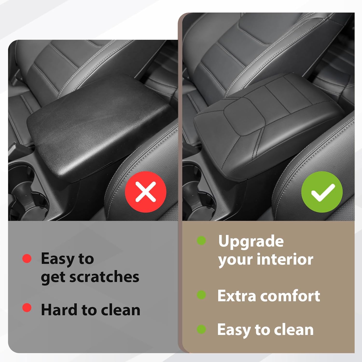 - Unique Design: Designed according to the OEM seat texture to make it match your interior perfectly and even better. Our armrest cover is crafted with high-quality Vegan Leather and an extra layer of foam, which is skin-friendly, breathable and soft.