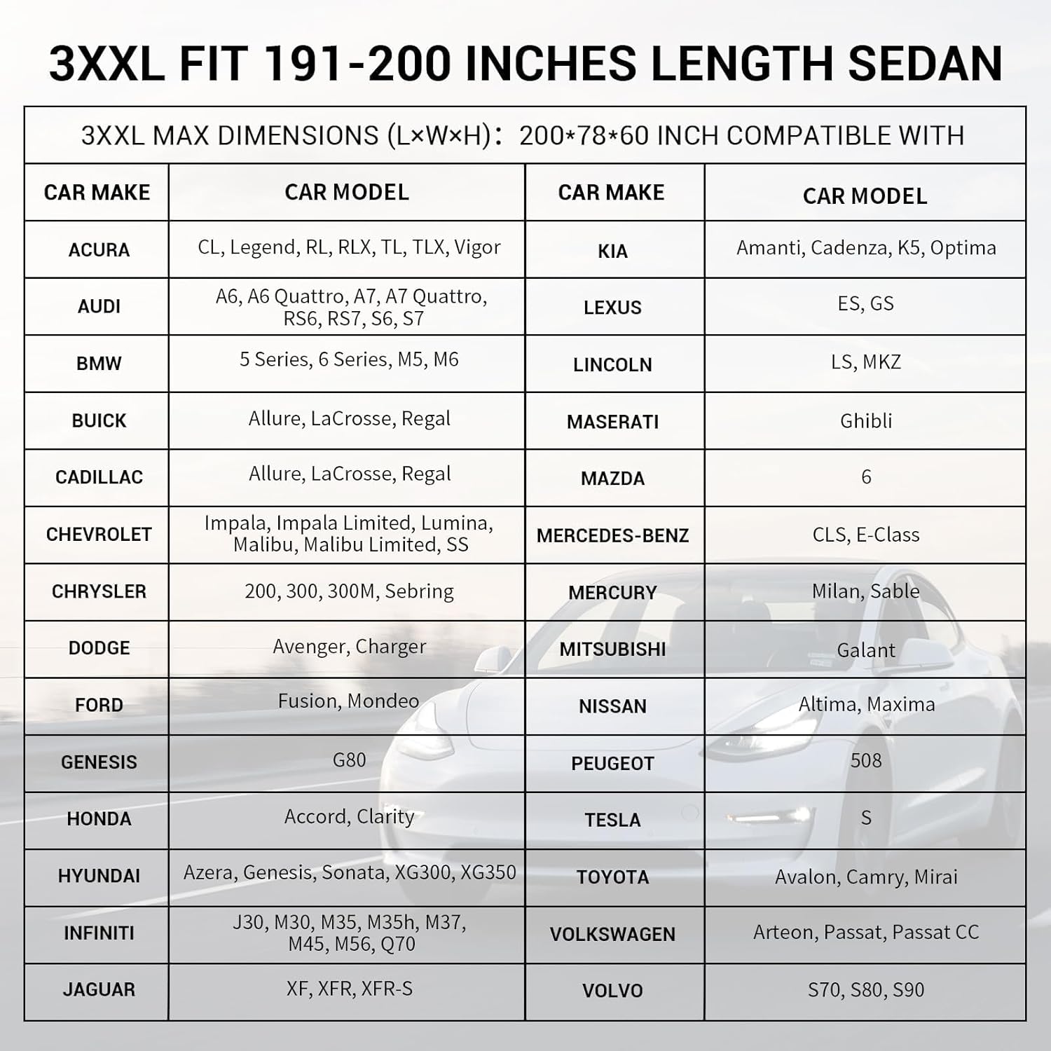 - UNIVERSAL FITMENT - Our 3XXL universal car cover is fit for sedan which length is 191 to 200 inches. Compatible with Hyundai Azera/Genesis/Sonata, Infiniti Q70, Kia Optima/K5/, Lexus ES, Nissan Altima/Maxima, Honda Accord, Chevrolet Malibu, Dodge Avenger/Charger, Chrysler 300, Ford Fusion, Acura CL/Legend/RL/RLX/TL/TLX, Audi A6/A7, Buick LaCrosse/Regal, Lincoln MKZ, etc. The Tecoom weather proof car covers are extensively tested to achieve a custom-like fit for each vehicle