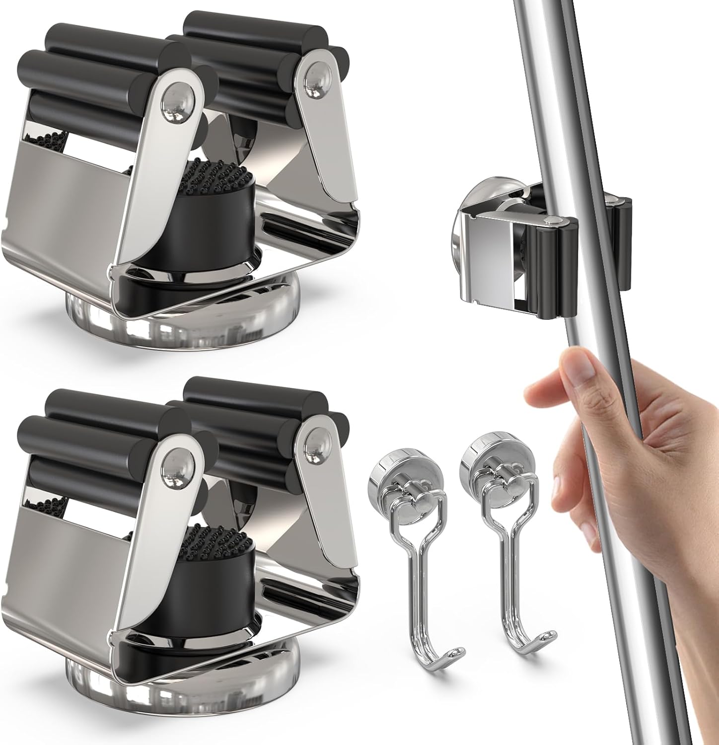 - 🧲[PREMIUM QUALITY] It comes with 2 strong magnetic broom hanger and 2 magnetic hooks.For the broom holder wall mount with Anti-Rust stainless steel and the grip of the abrasion-resistant silicone grip keeps broom and dustpan,tools,shovels very well, mop and broom holder wall mount won't fall off easily last for years,for the magnetic hooks you can easily stick to the surface of refrigerator, iron door, iron filing cabinet