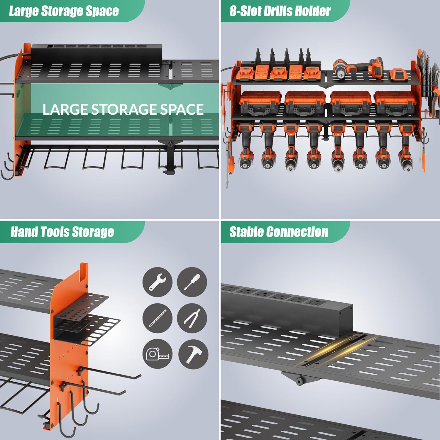 Suchtale Power Tool Organizer with Charging Station,33.2''Garage 8 Drill Holders Wall Mount,3 Layers Heavy Duty Metal Tool Shelf with 8 Outlets Power Strip, Gift for Men, Father, Orange